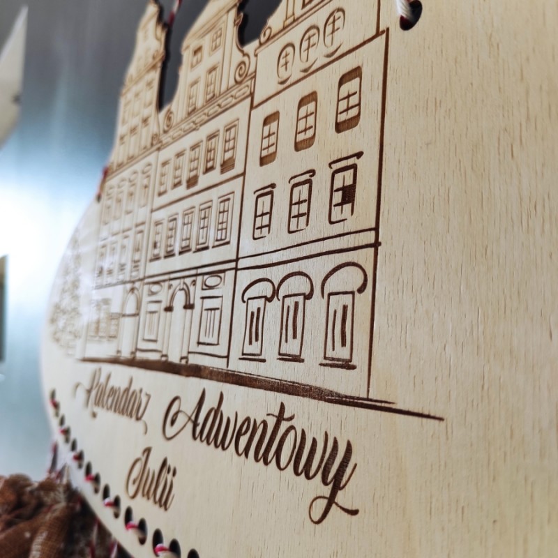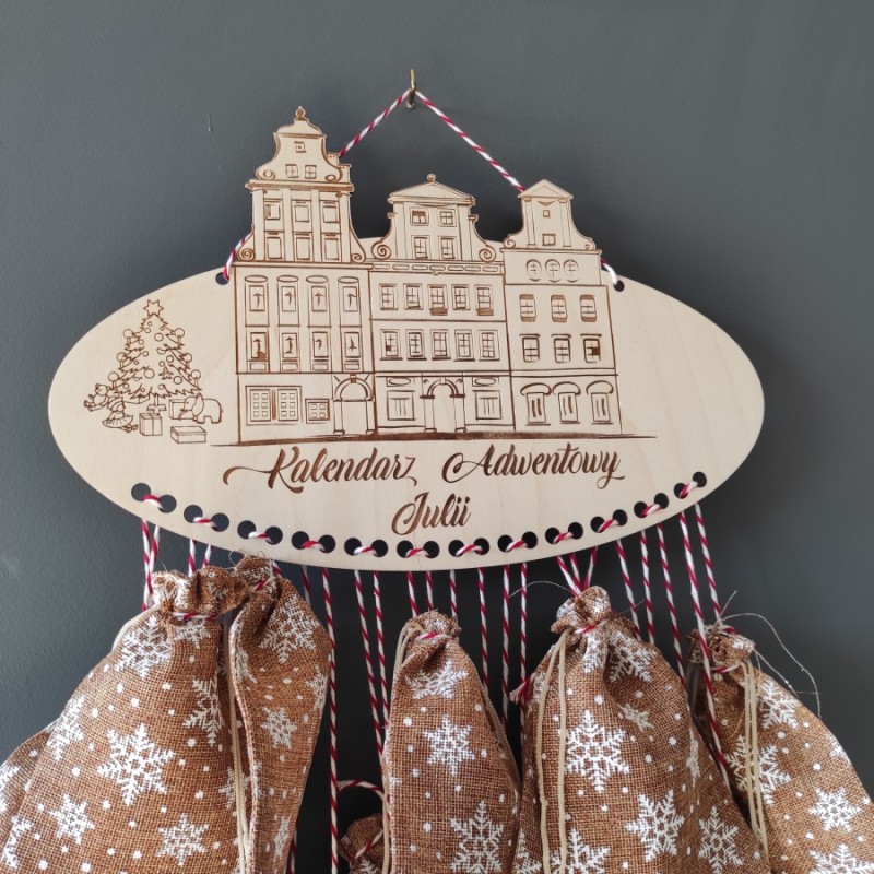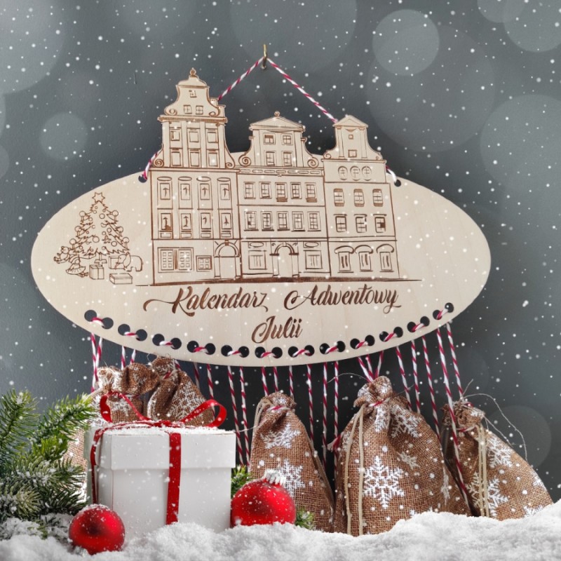 Spraw dziecku radość i wykonaj z nim samodzielnie kalendarz. Do bazy przymocuj sznureczki, na których umieścisz woreczki, domki, z drobnymi upominkami na każdy dzień grudnia, co umili oczekiwanie na Święta. Kalendarz posiada ozdobną grafikę oraz personalizację (imię dziecka) wykonane metodą grawerunku.