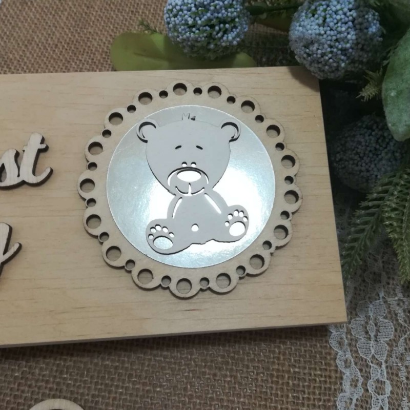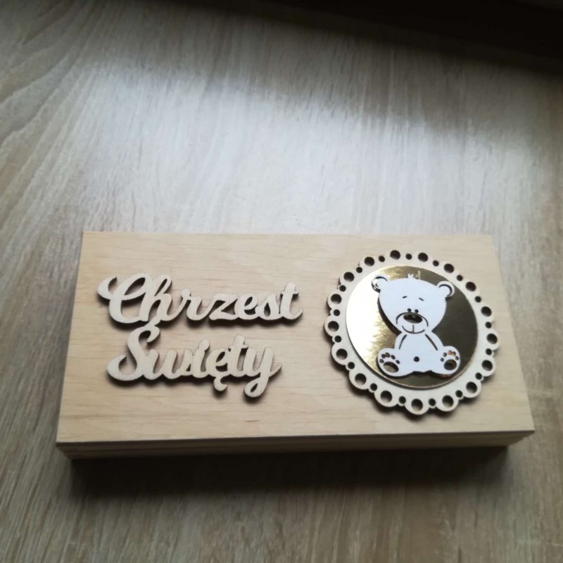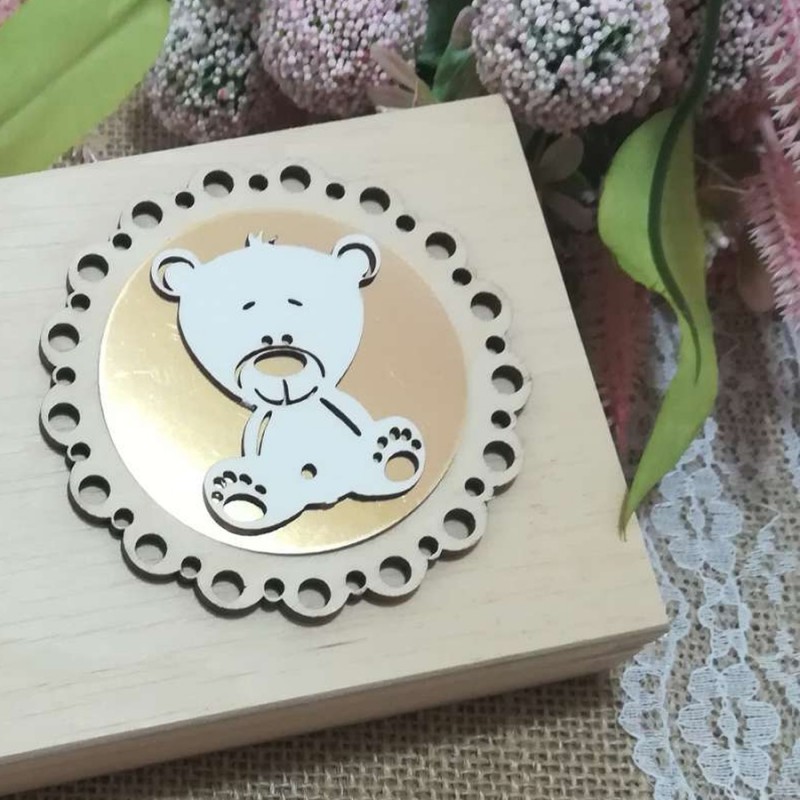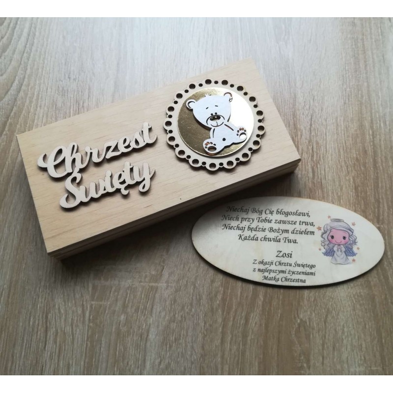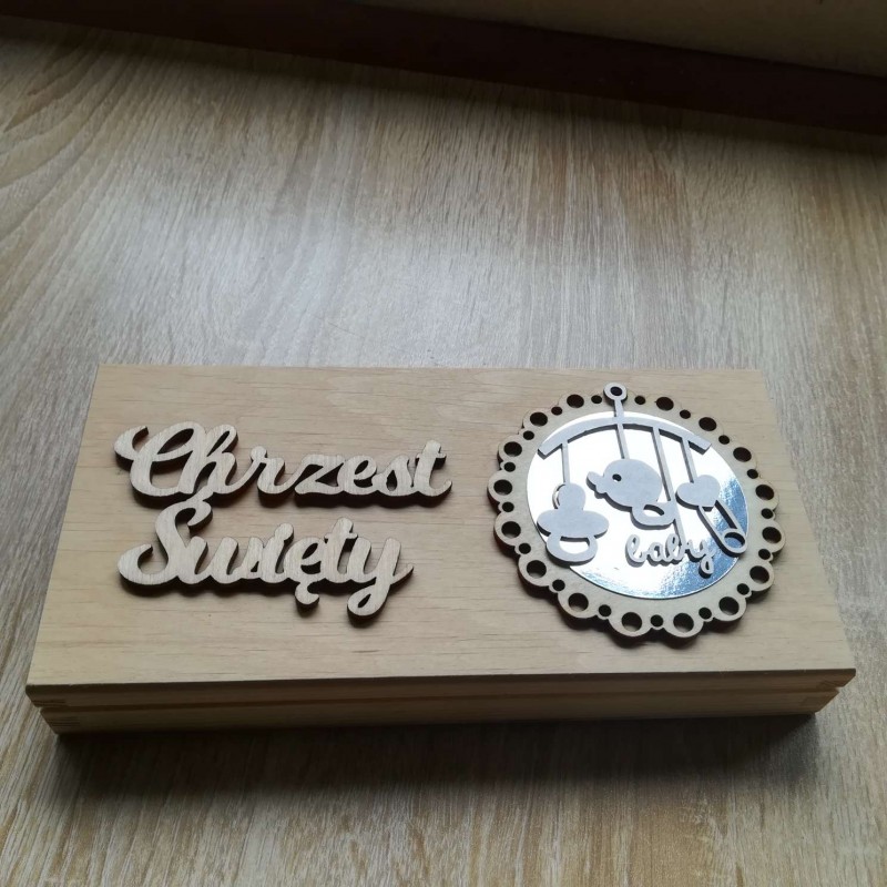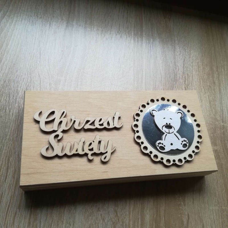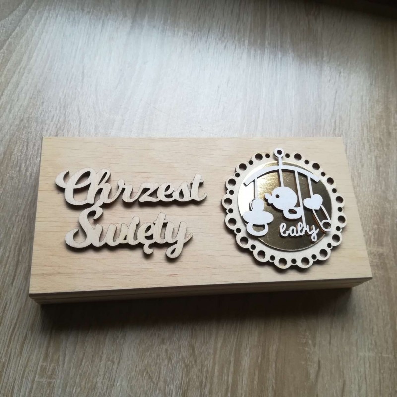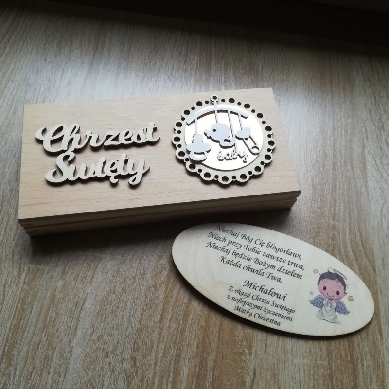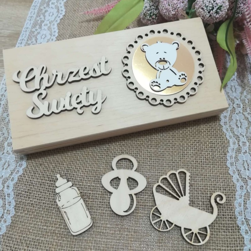 Pudełko zawiera pełne zdobienie na zewnątrz, do wyboru kilka opcji (wybór dekoru: miś lub karuzela łóżeczkowa oraz koloru papieru lustrzanego: złoto lub srebro). Wewnątrz personalizowane życzenia (dla kogo, od kogo).