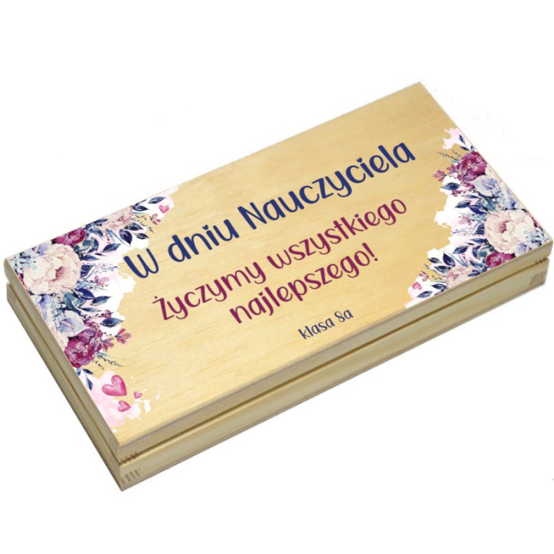 Drewniane pudełko, które doskonale sprawdzi się jako eleganckie opakowanie na czekoladę. Pudełko posiada pamiątkowy nadruk uv w kolorze z okazji Dnia Nauczyciela. Po zjedzeniu zawartości pudełko można wykorzystać do przechowywania drobiazgów.