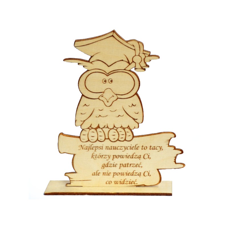 Przedmiotem sprzedaży jest SOWA - statuetka na podstawce, wykonana ze sklejki grubości 3mm. Sowa posiada grawer : " Trzeba mieć wielkie serce aby uczyć małych ludzi ".