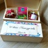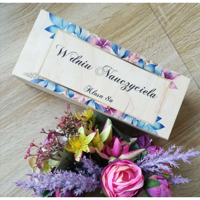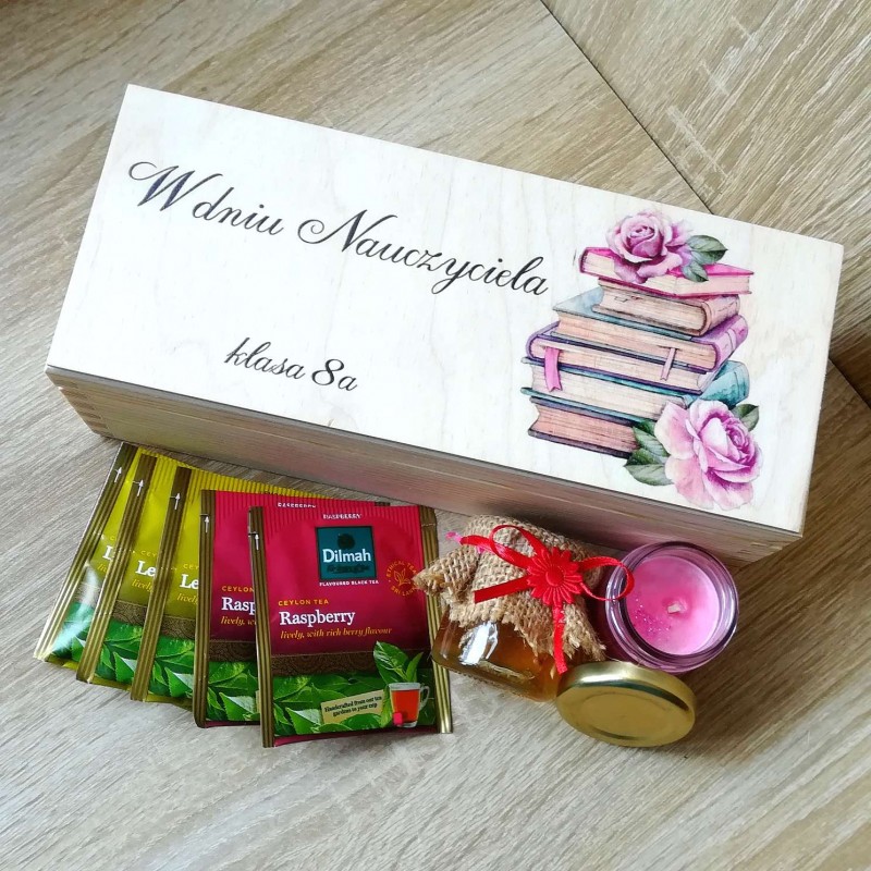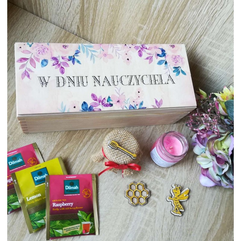 Drewniane pudelko z trzema przegrodami. Każda z nich wypełniona wełną drzewną oraz odpowiednio w każdej przegródce 5 szt herbat, słoiczek miodu wielokwiatowego 40ml oraz ręcznie robioną świeczuszkę sojową 40ml (ok 8h palenia, zapachy pakowane w zależności od dostępności). Na wierzchu pudełko posiada okazjonanlny, trwały, koloroy nadruk uv dedykowany Dniem Nauczyciela. Całość tworzy wyjątkowy, pamiątkowy prezent.