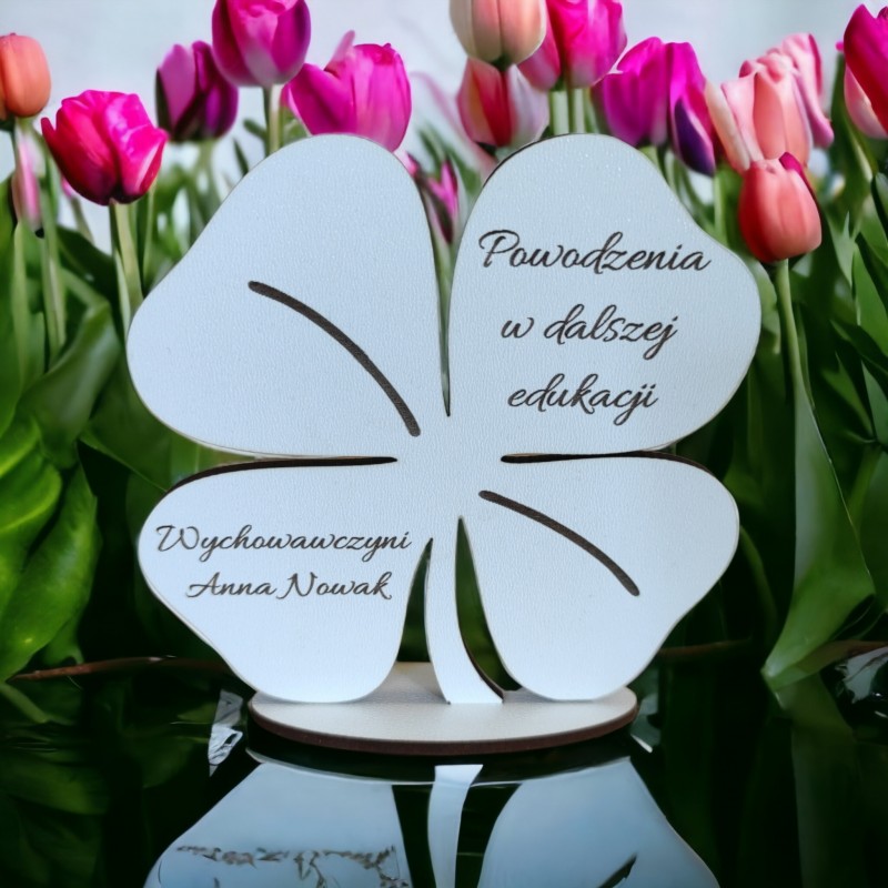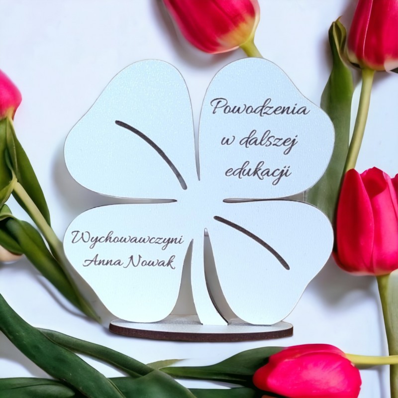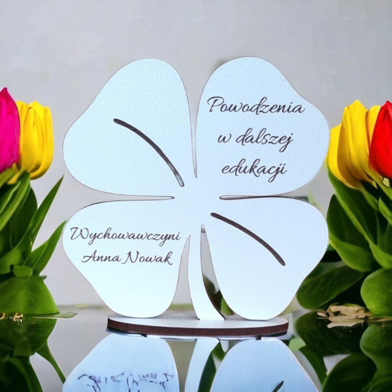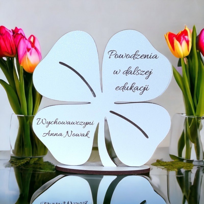 Figurka na podstawce wycięta z należytą precyzją. Posiada piękny, pamiątkowy grawer. Idealny prezent dla ucznia czy przedszkolaka. Będzie doskonałym upominkiem na zakończenie roku szkolnego, ósmej klasy. Kształt koniczynki sprawia, że może być amuletem przynoszącym szczęście. Będzie pełnił rolę doskonałej dekoracji i zostanie pamiątką na lata. Satuetka jest spersonalizowana.
