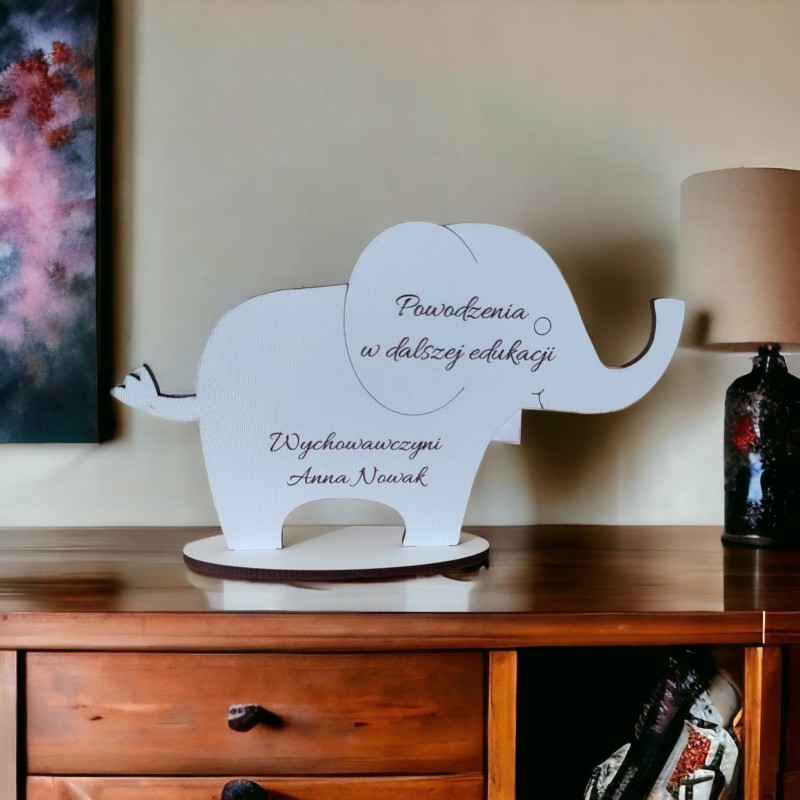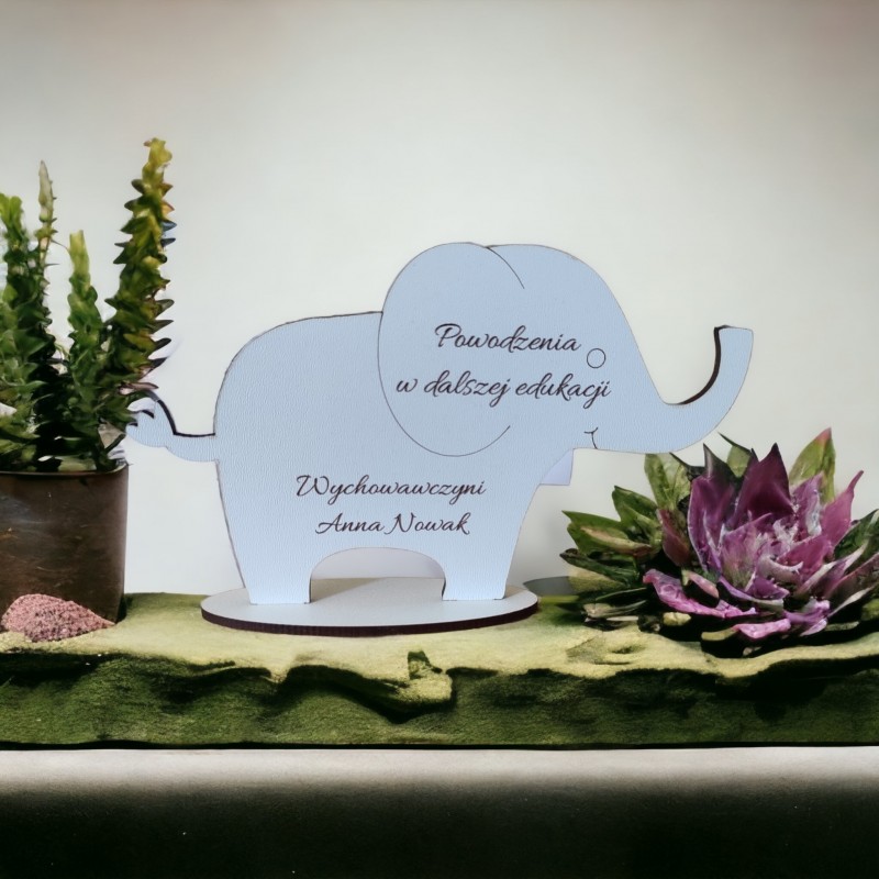 Figurka na podstawce wycięta z należytą precyzją. Posiada piękny, pamiątkowy grawer. Idealny prezent dla ucznia czy przedszkolaka. Będzie doskonałym upominkiem na zakończenie roku szkolnego, ósmej klasy. Kształt słonika sprawia, że może być amuletem przynoszącym szczęście. Będzie pełnił rolę doskonałej dekoracji i zostanie pamiątką na lata. Statuetka jest spersonalizowana.