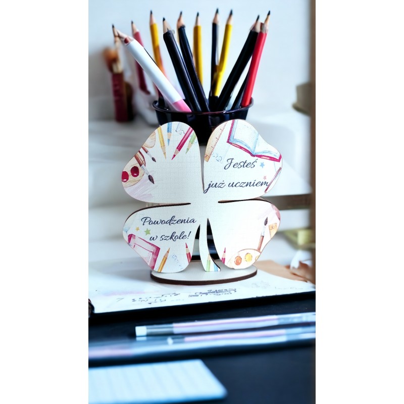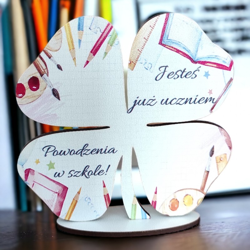 Figurka na podstawce wycięta z należytą precyzją. Posiada piękny, pamiątkowy nadruk w kolorze. Idealny prezent dla ucznia, który rozpoczyna przygodę z edukacją. Będzie doskonałym upominkiem na pasowanie na ucznia. Kształt koniczynki sprawia, że może być amuletem przynoszącym szczęście. Będzie pełnił rolę doskonałej dekoracji i zostanie pamiątką na lata. Po zakupie podaj wzór oraz od kogo jest upominek!!!