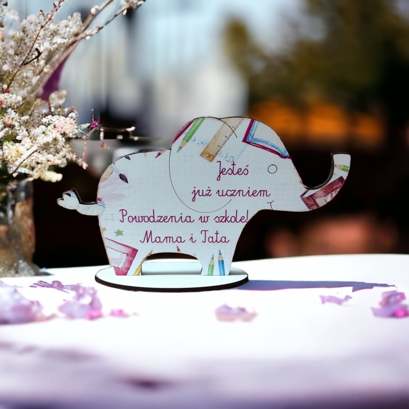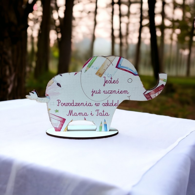 Figurka na podstawce wycięta z należytą precyzją. Posiada piękny, pamiątkowy nadruk w kolorze. Idealny prezent dla ucznia, który rozpoczyna przygodę z edukacją. Będzie doskonałym upominkiem na pasowanie na ucznia. Kształt słonia sprawia, że może być amuletem przynoszącym szczęście. Będzie pełnił rolę doskonałej dekoracji i zostanie pamiątką na lata. Słonik jest personalizowany, po zakupie podaj wzór oraz od kogo jest upominek!!!