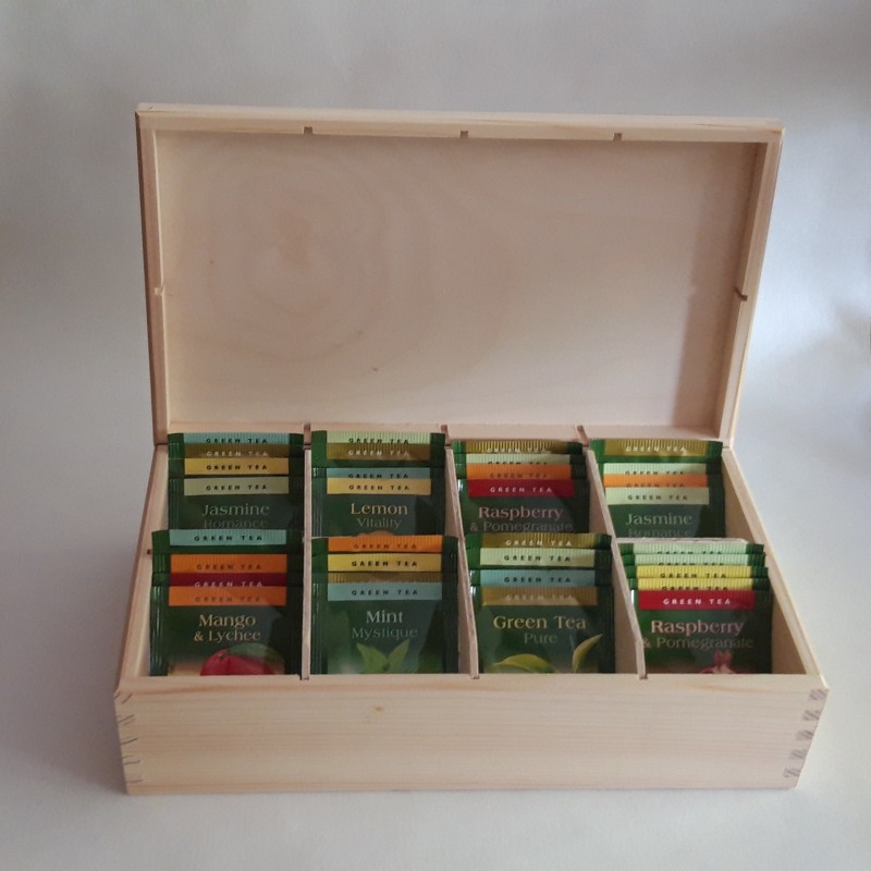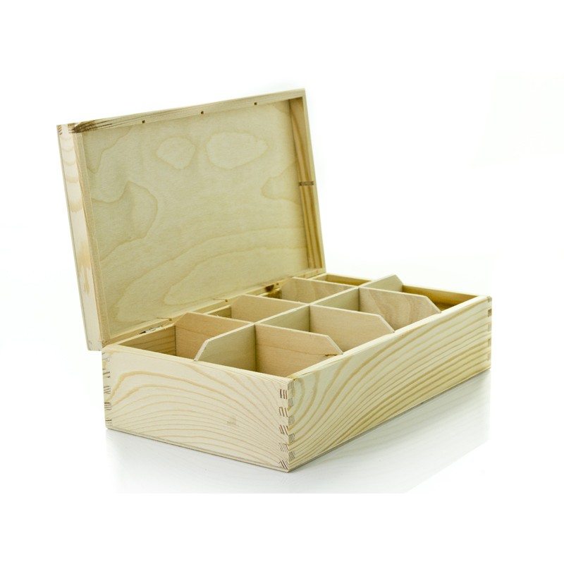 Pudełko z drewna sosnowego na 8 przegród (nie zawiera herbaty). Herbatkę możesz u nas zakupić osobno. Możemy także zapakować na prezent.