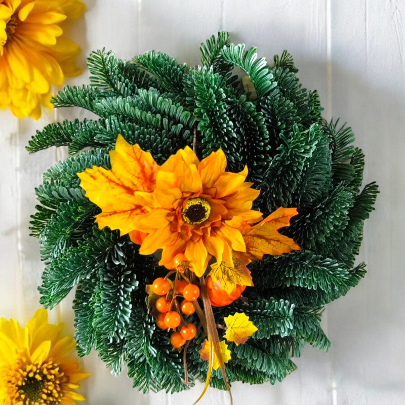 Baza może być wykorzystana do utworzenia ozdoby świątecznej jako dekoracji drzwi wejściowych również jako kompozycja florystyczna do dekoracji pomnika na święto 1 Listopada - Wszystkich Świętych.