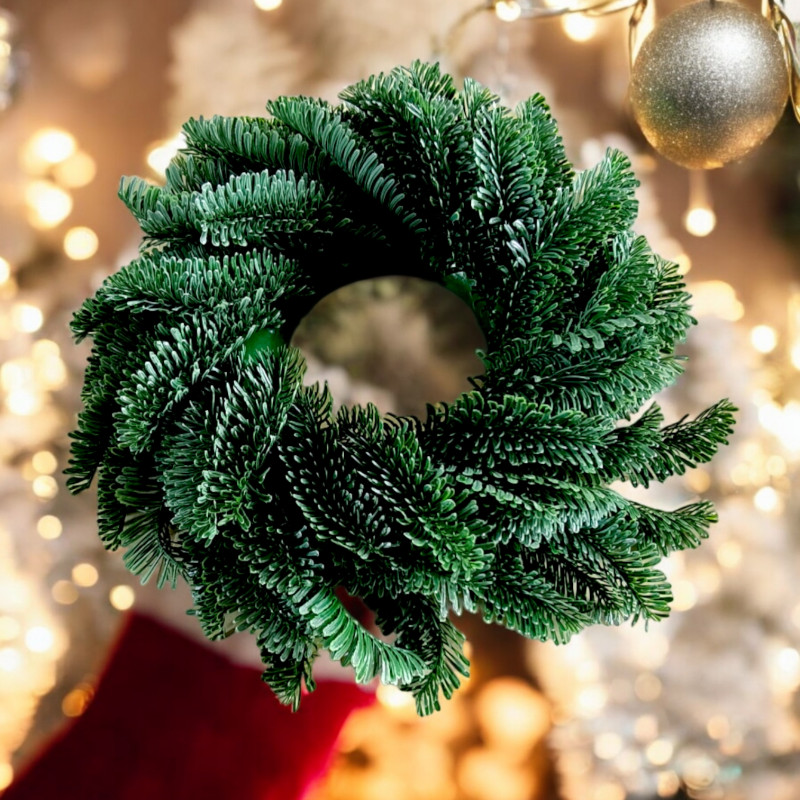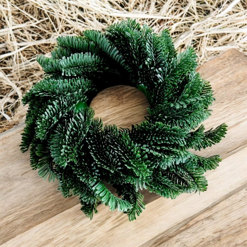 Wianek wykonany jest z sztucznego igliwia zamocowanego na plastikowej okrągłej formie. Gałązki zamocowane są na dwóch warstwa dzięki temu wieniec wygląda bardzo elegancko, imitując dekoracje z naturalnego igliwia. Solidna plastikowa baza jest dobrze ukryta przy czym umożliwia stabilne mocowanie na rożnych płaszczach.