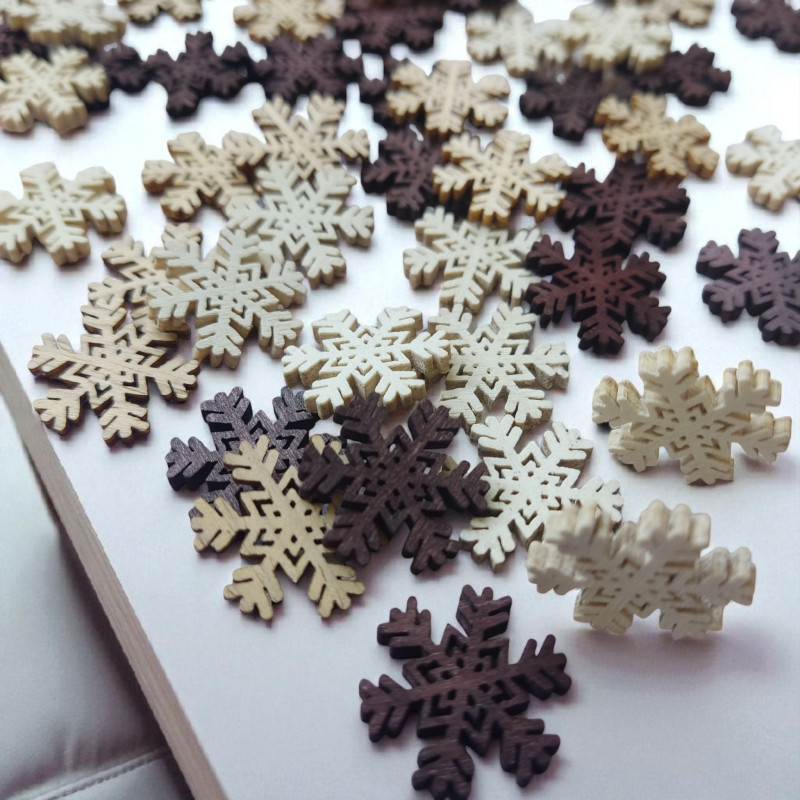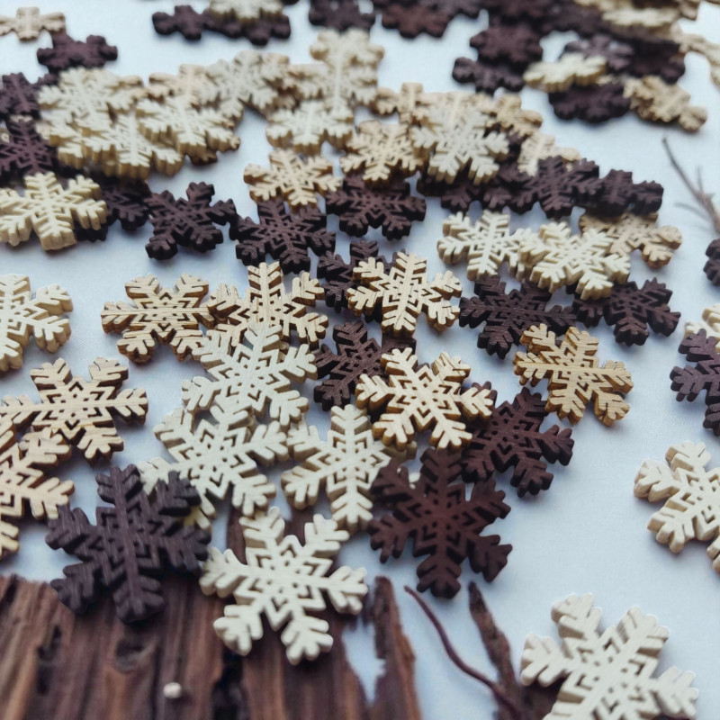 Zestaw zawiera 24szt. śnieżynek w 3 kolorach (beż, brąz, biel)