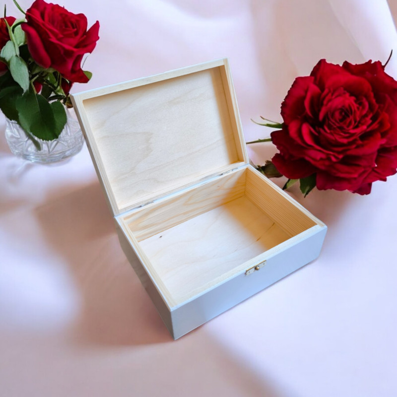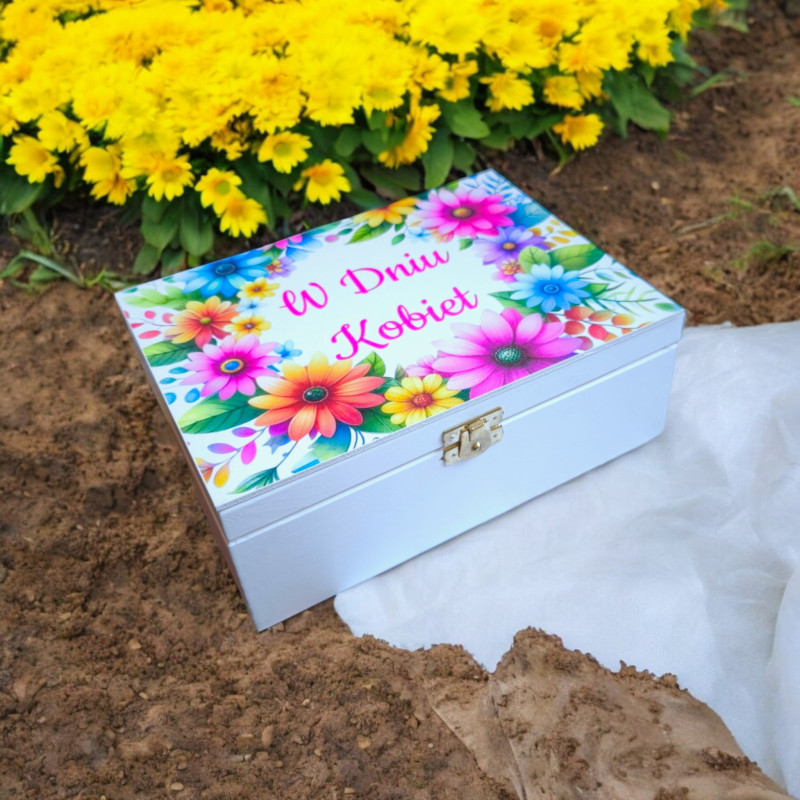 Eleganckie, piękne drewniane pudełko w białym kolorze, zamykane na złoty zatrzask. Precyzyjnie wykonane. Na zewnątrz posiada efektowną grafikę, wykonaną metodą trwałego nadruku uv, które będzie oryginalnym i wyjątkowym prezentem. Pudełko sprawdzi się jako ona zdjęcia, kosmetyki czy inne drobiazgi.