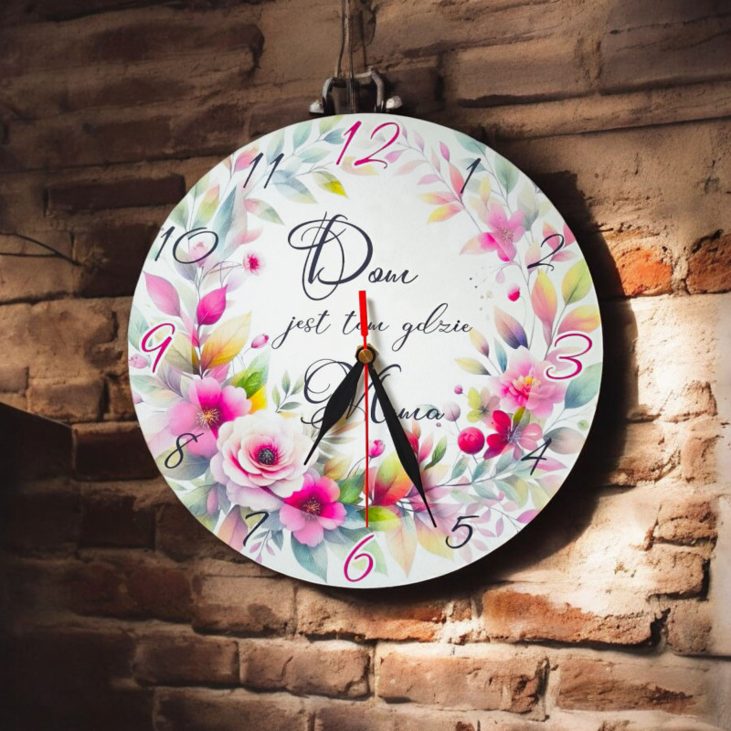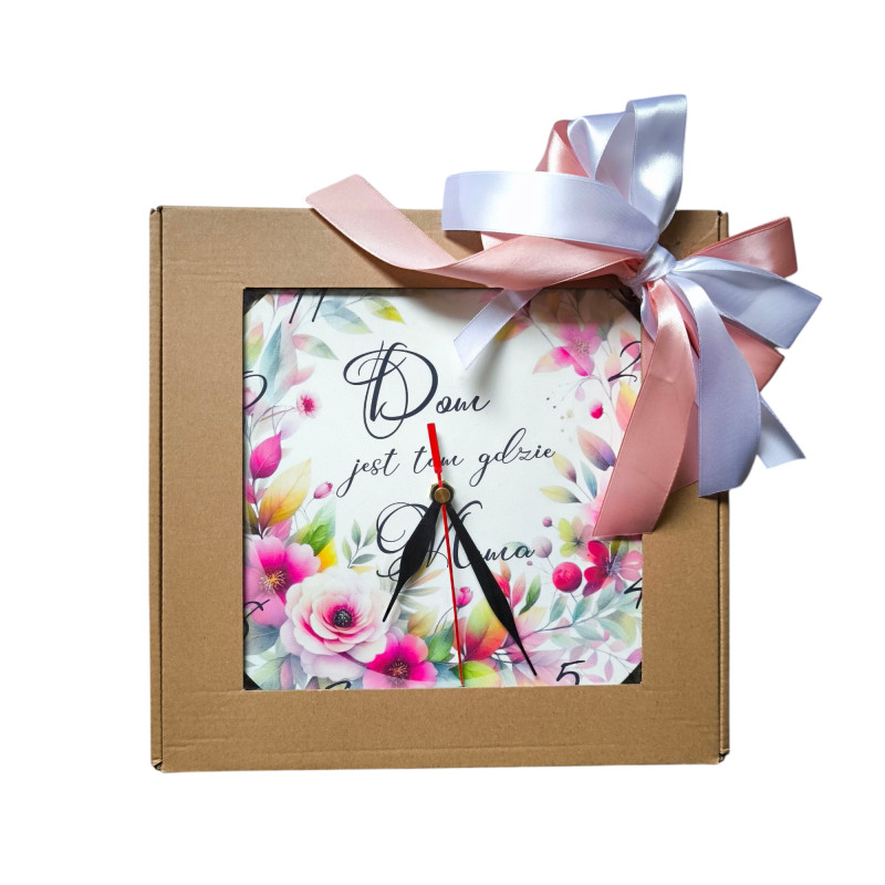 Zegar zapakowany w elegancki kartonik z okienkiem i piękną kolorową kokardę.