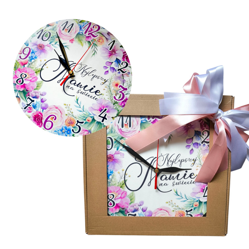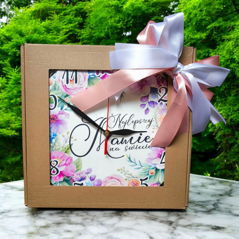 Zegar zapakowany w elegancki kartonik z okienkiem i piękną kolorową kokardę.