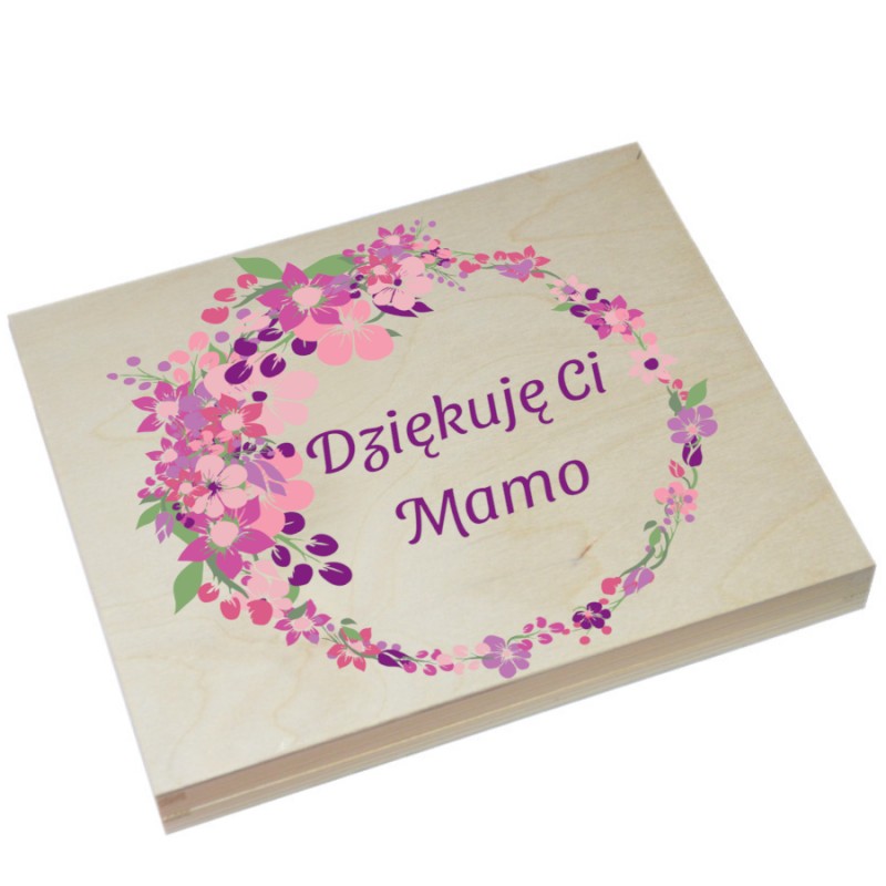 które doskonale sprawdzi się jako eleganckie, wyjątkowe opakowanie na czekoladki Merci, można też sprezentować w nim np zdjęcia. Po zjedzeniu zawartości służyć może jako ozdobne pudełeczko na przechowywanie drobiazgów. Pudełko jest w kolorze naturalnego drewna ozdobione kolorowym, pamiątkowym nadrukiem.