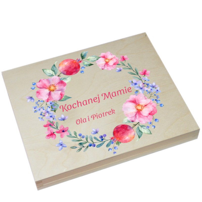 które doskonale sprawdzi się jako eleganckie, wyjątkowe opakowanie na czekoladki Merci, można też sprezentować w nim np zdjęcia. Po zjedzeniu zawartości służyć może jako ozdobne pudełeczko na przechowywanie drobiazgów. Pudełko jest w kolorze naturalnego drewna ozdobione kolorowym, pamiątkowym nadrukiem.