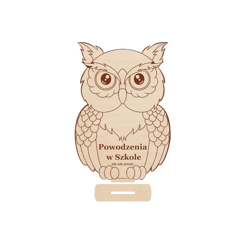 Przedmiotem sprzedaży jest sowa statuetka z grawerem ,  wykonane ze sklejki o grubości 3mm. Podsiada pamiątkowy grawer.