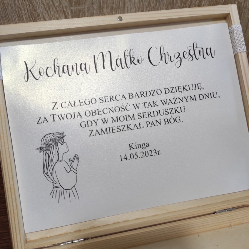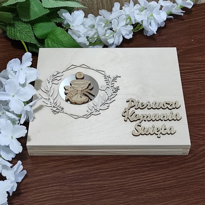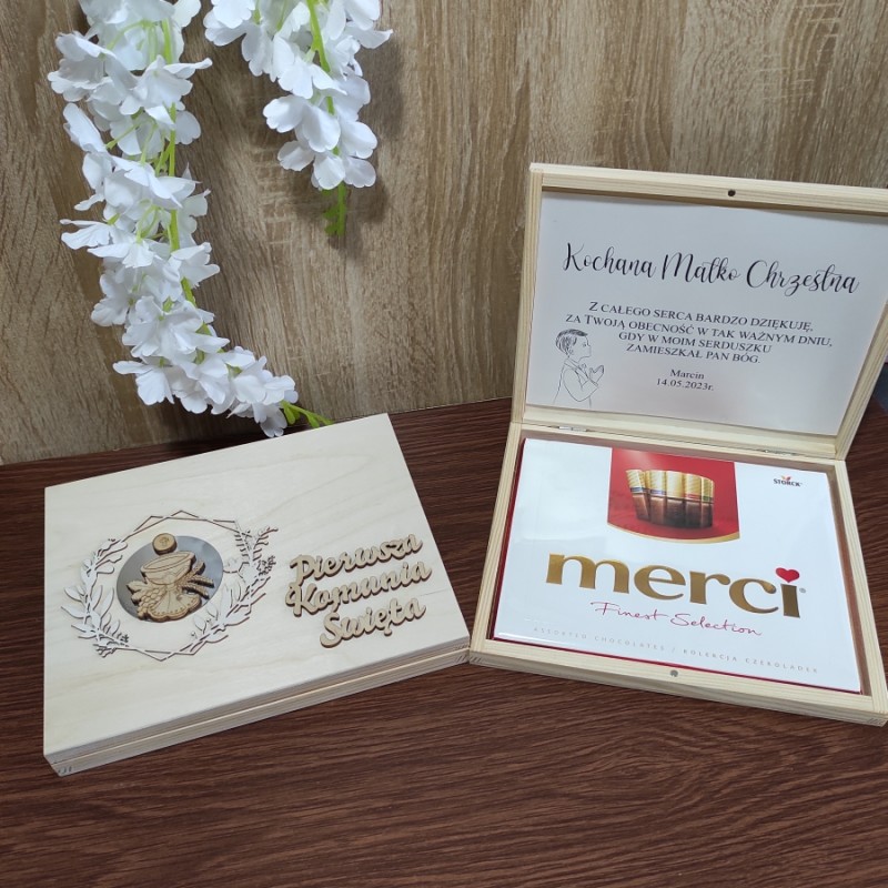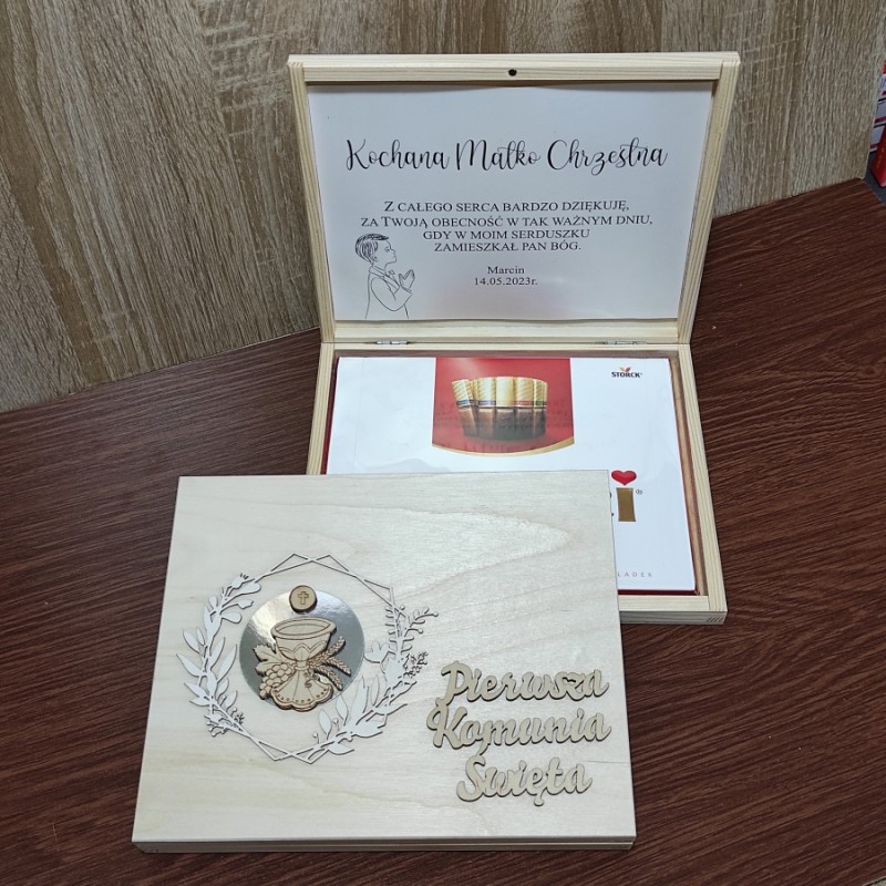 Wyjątkowa forma podziękowania za obecność na I Komunii Świętej dla naszych gości, a w szczególności Rodziców Chrzestnych i Dziadków. Pudełko na wierzchu posiada wycięty ze sklejki napis: Pierwsza Komunia Święta, kielich IHS umieszczony w ozdobnym wianuszku. W środku pamiątkowy tekst podziękowania drukowany na papierze ozdobnym (nie zapomnij podać dla kogo!!!).