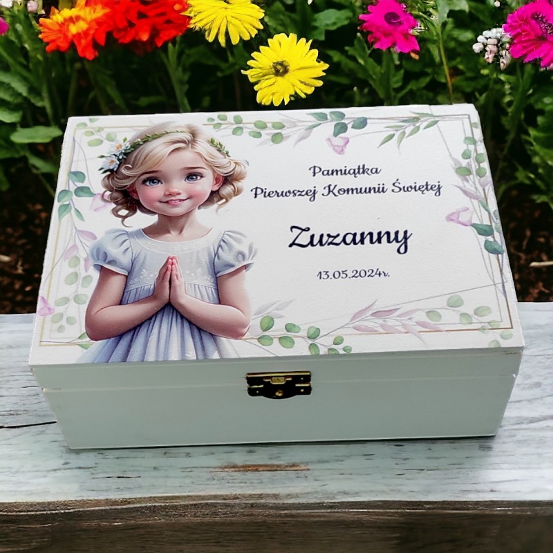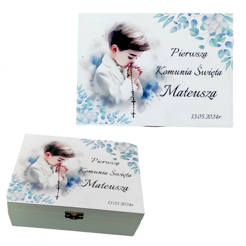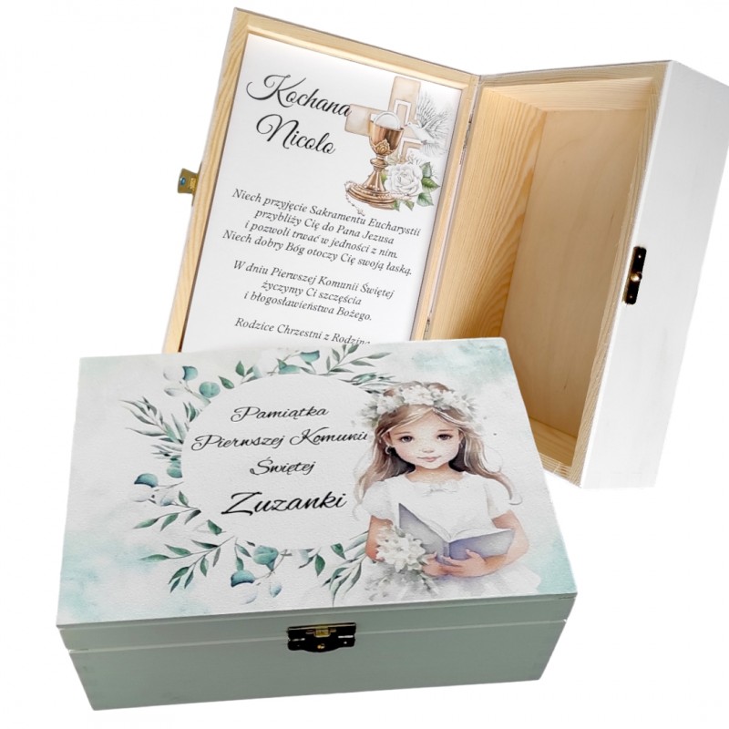 Eleganckie, piękne drewniane pudełko w białym kolorze, zamykane na złoty zatrzask. Precyzyjnie wykonane. Na zewnątrz oraz w środku posiada efektowną dedykacją na Komunię, wykonaną metodą trwałego nadruku uv, które będzie oryginalnym i wyjątkowym, personalizowanym prezentem. Pudełko sprawdzi się jako opakowanie na Biblię lub inny upominek, a w późniejszym czasie jako pudełko na zdjęcia czy inne drobiazgi.