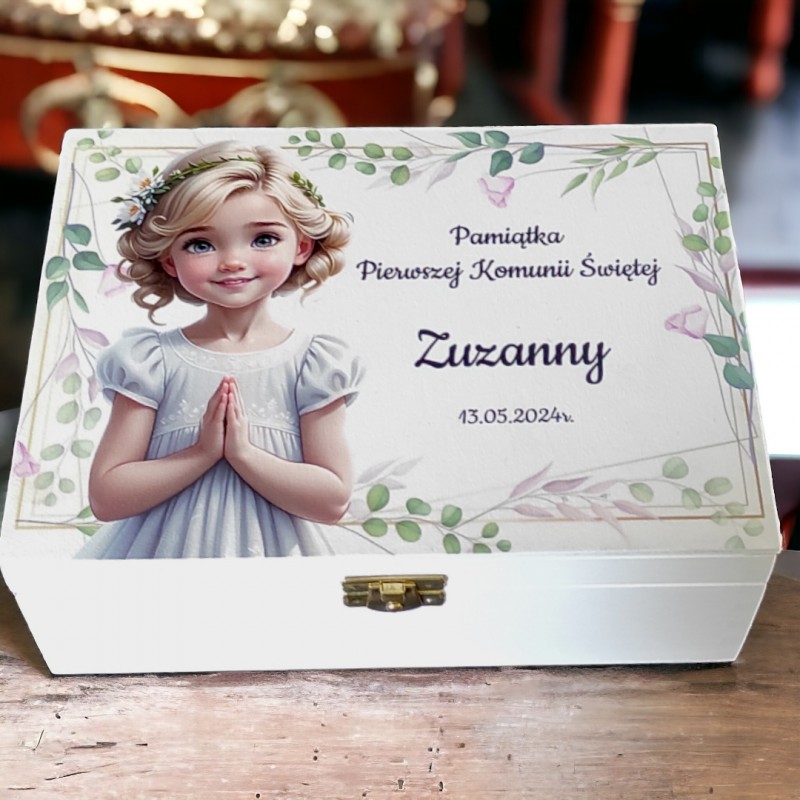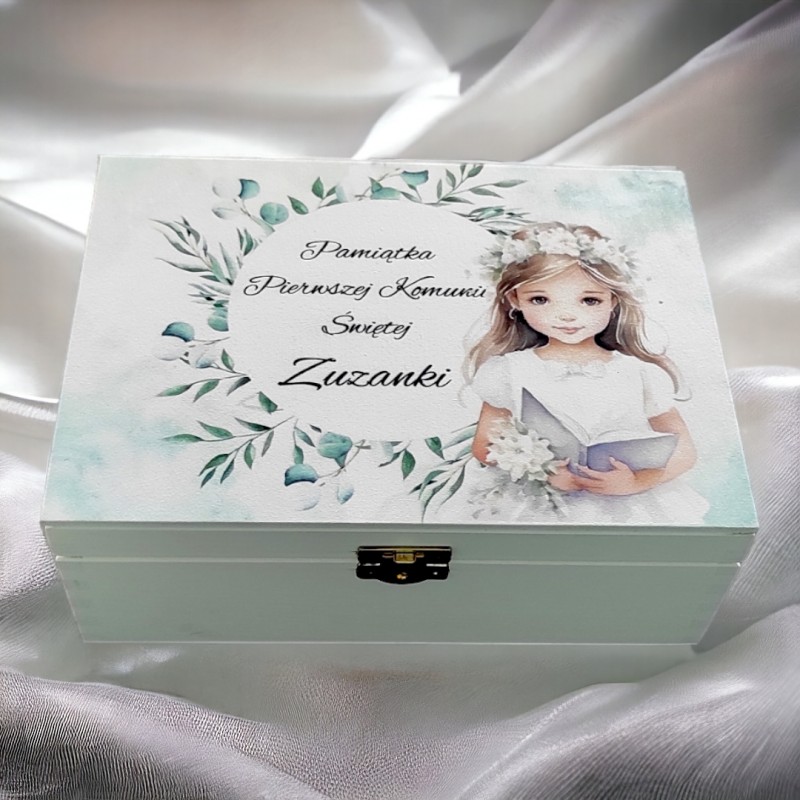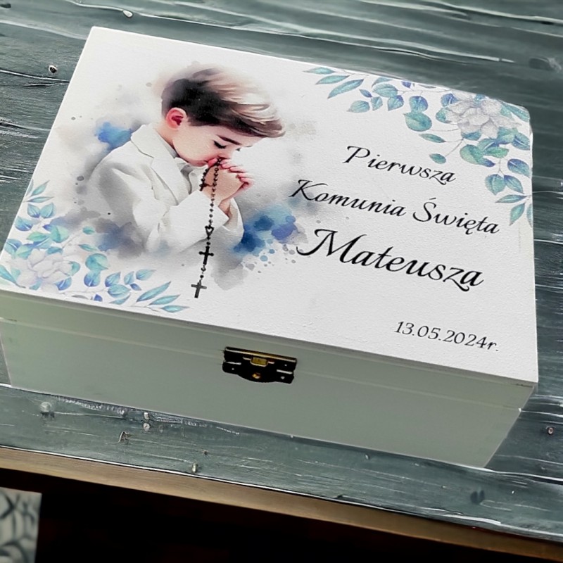 Eleganckie, piękne drewniane pudełko w białym kolorze, zamykane na złoty zatrzask. Precyzyjnie wykonane. Na zewnątrz oraz w środku posiada efektowną dedykacją na Komunię, wykonaną metodą trwałego nadruku uv, które będzie oryginalnym i wyjątkowym, personalizowanym prezentem. Wewnątrz piękna Biblia dla dzieci w twardej oprawie, znajdzie się również miejsce na dołożenie banknotów.