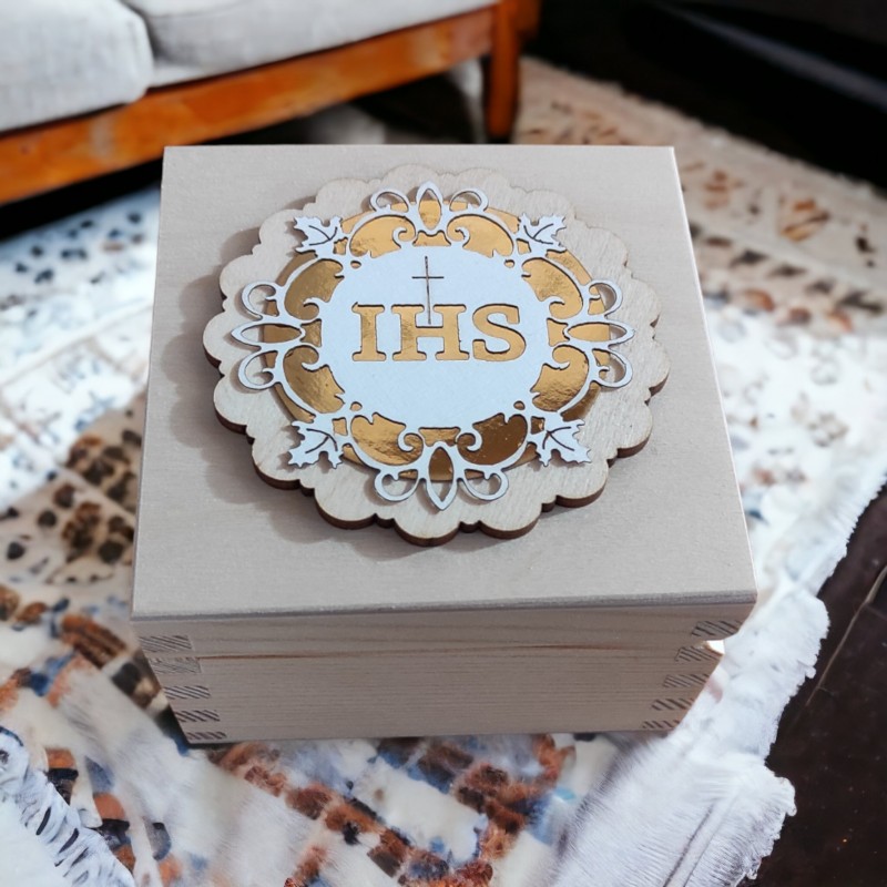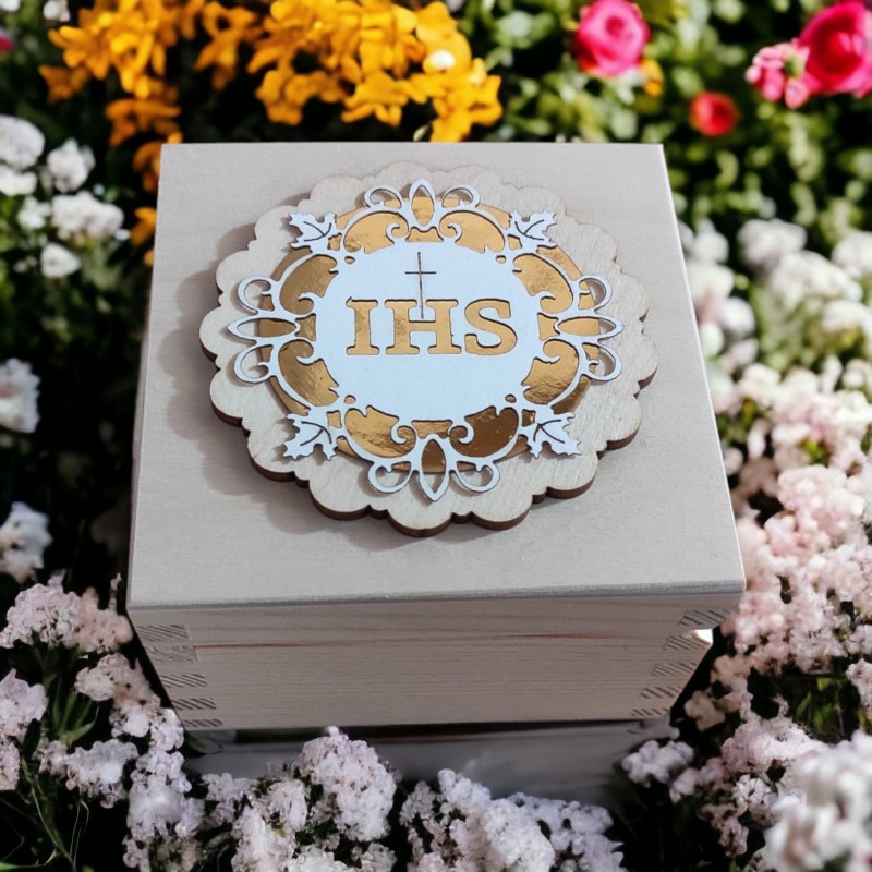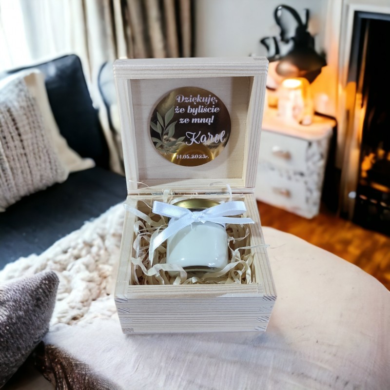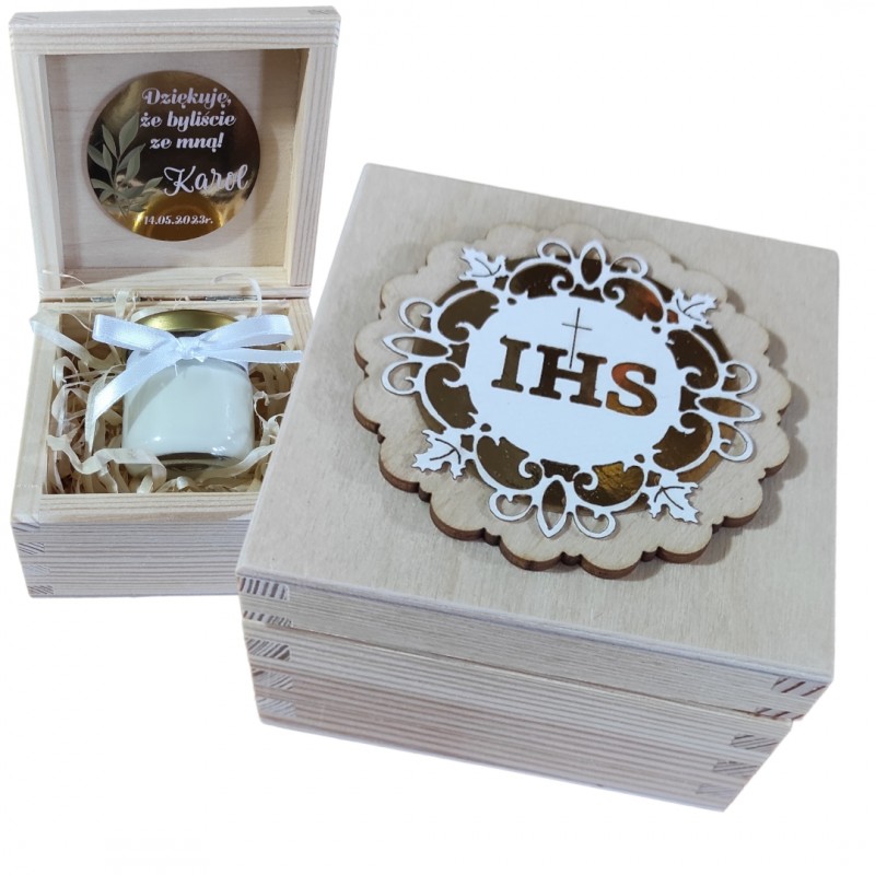 Piękne drewniane pudełko w naturalnym kolorze, precyzyjnie wykonane z efektowną dedykacją na Komunię, które będzie oryginalnym i wyjątkowym prezentem. Na zewnątrz komunijny emblemat IHS, w wewnątrz wklejone podziękowanie, wykonane na papierze lustrzanym, o wyglądzie przestrzennym. Dodatkowo pudełko zawiera ręcznie robioną świece sojową, przewiązaną satynową kokardką.