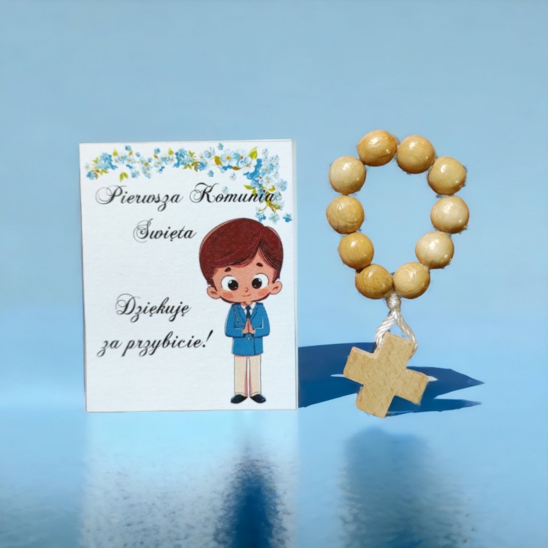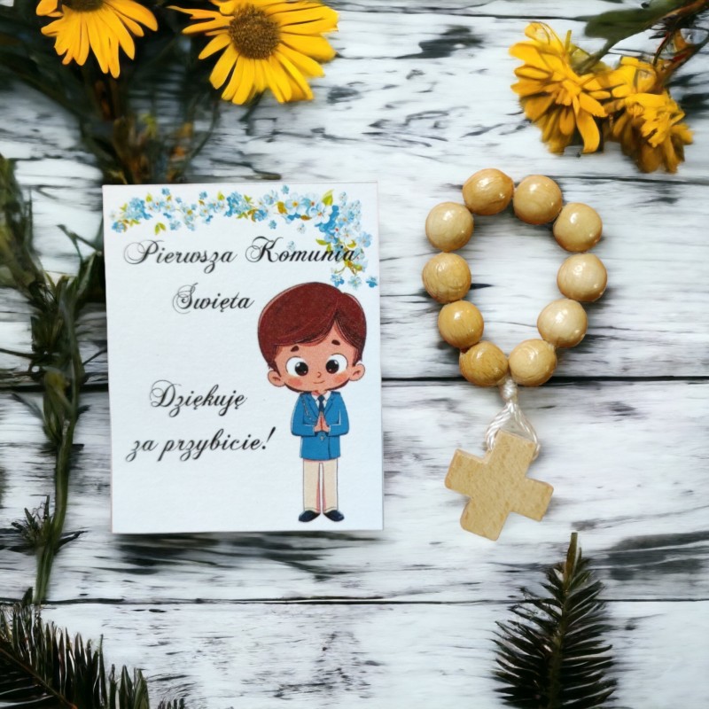 Pamiątka dla gości z okazji Komunii Świętej - karteczka z podziękowaniem i 10 -tka różańca