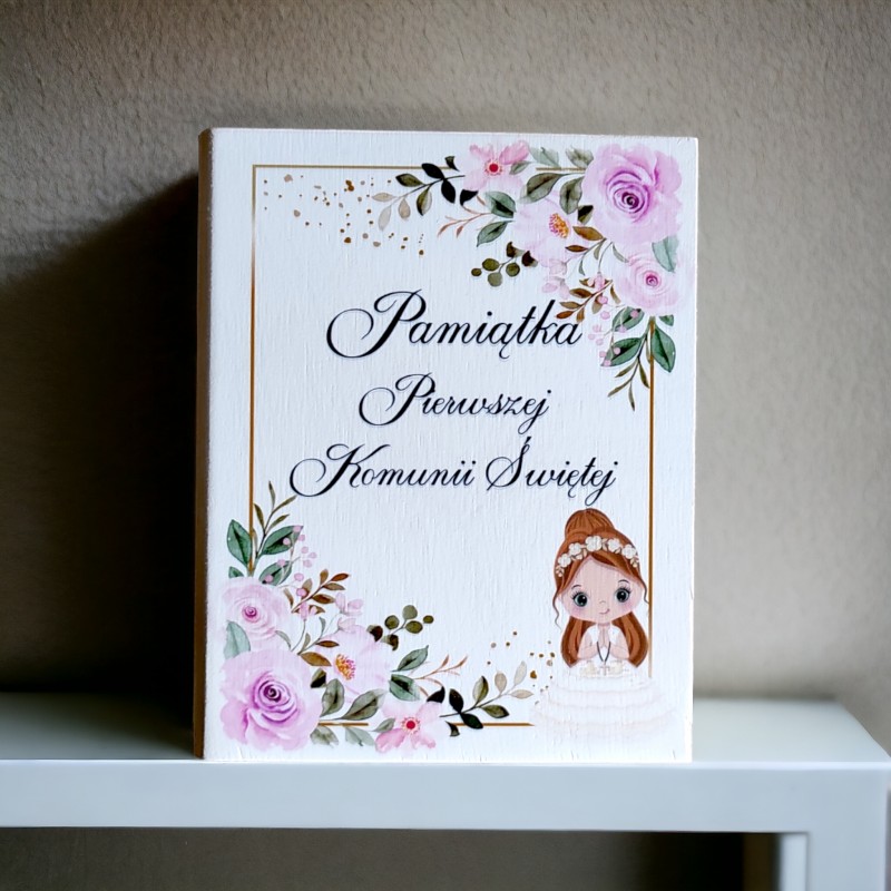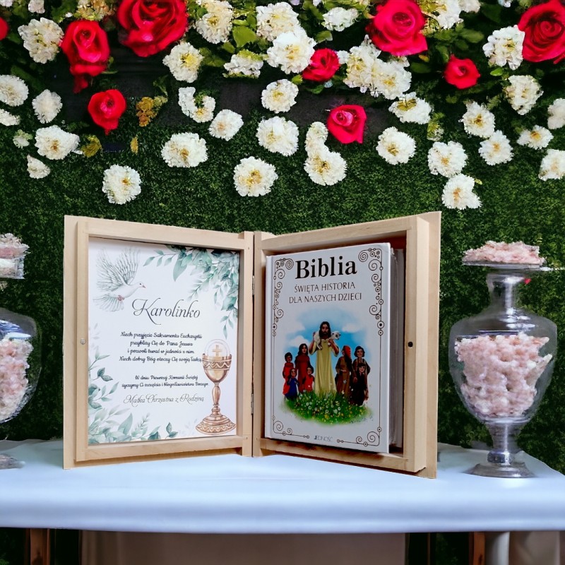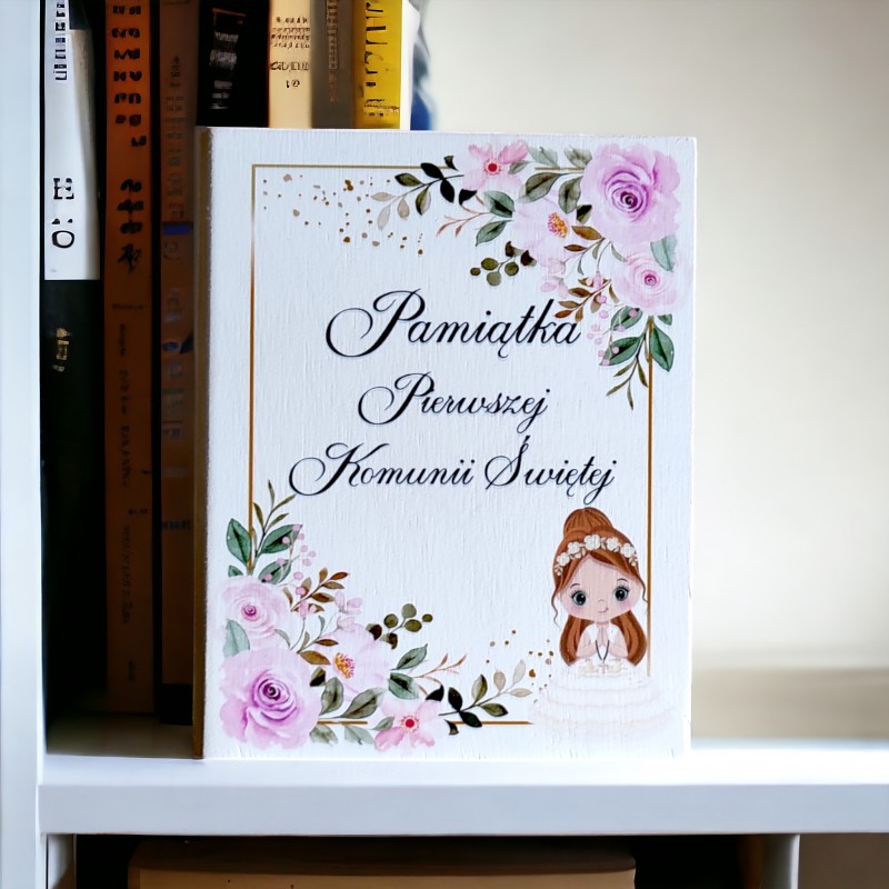 - personalizację wklejki z życzeniami (imię dziecka, datę Komunii i od kogo jest prezent)