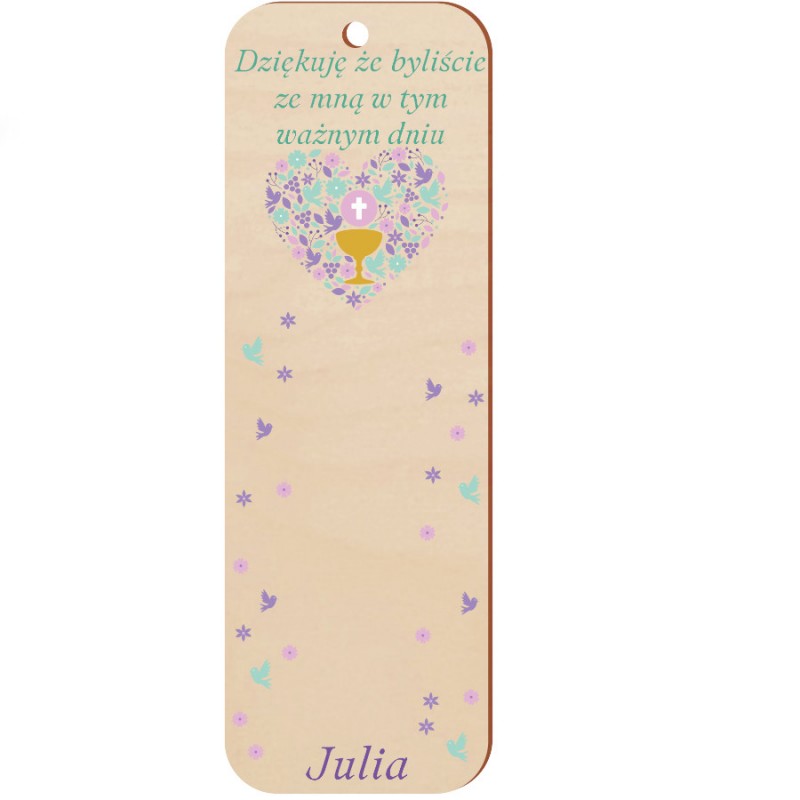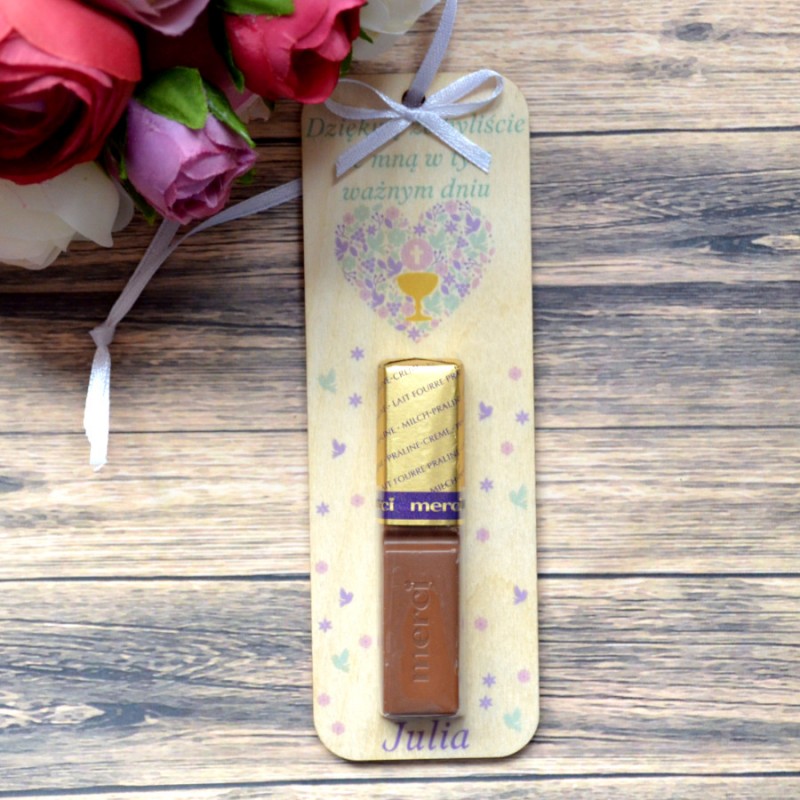 Przedmiotem sprzedaży jest drewniane podziękowanie za obecność na I Komuni Świętej.
