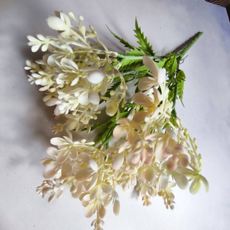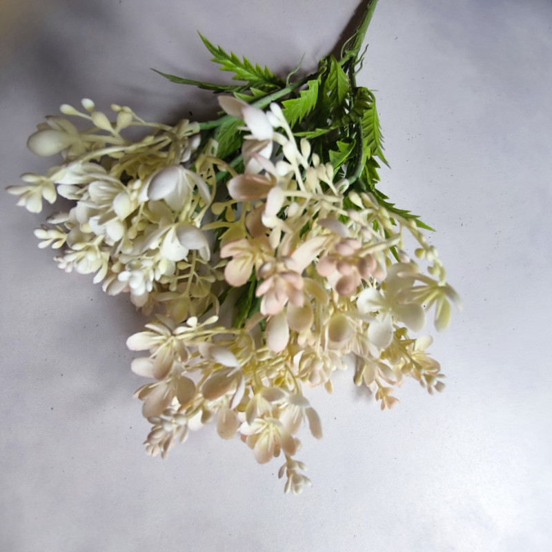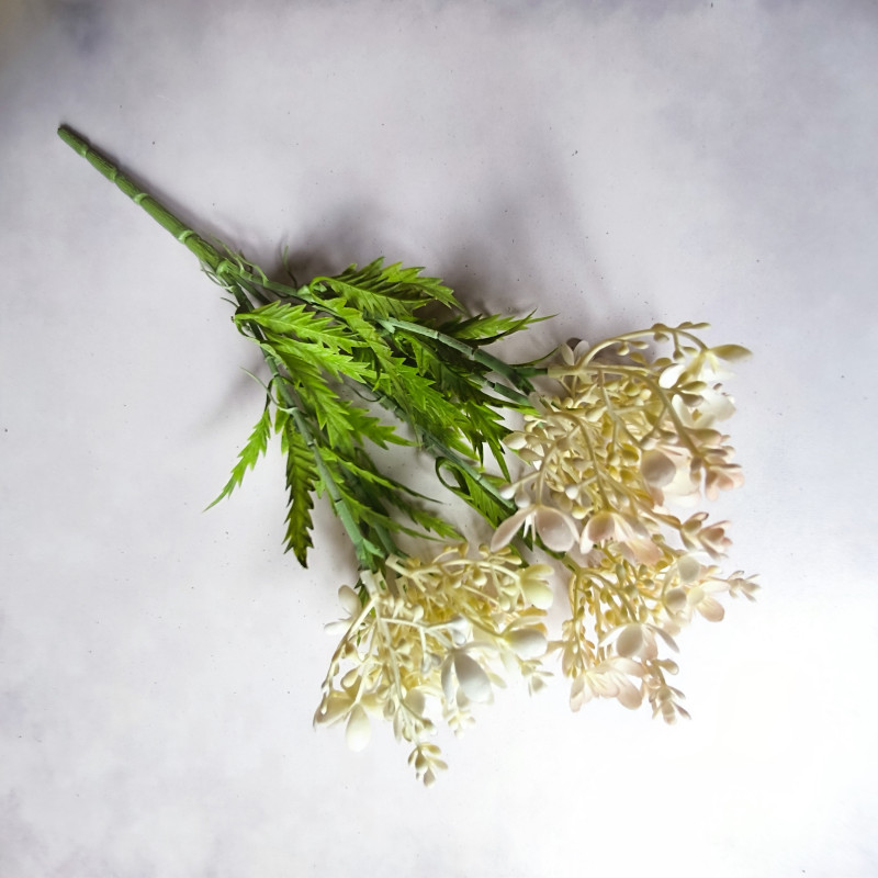 Nowoczesna dekoracja do salonu, biura, wazonu lub kompozycji florystycznej. Dodaj wyjątkowy akcent do swojego wnętrza dzięki tej efektownej ozdobie z drobnymi kwiatuszkami, pączkami i listkami! Realistyczne wykonanie i modna kolorystyka – cieniowane kolory – sprawiają, że ta sztuczna roślina idealnie wpisuje się w styl boho, glamour, loftowy i skandynawski.
