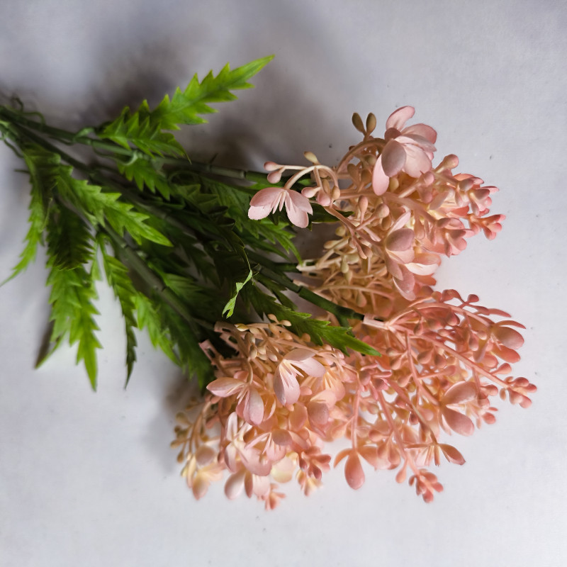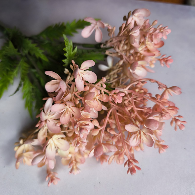 Nowoczesna dekoracja do salonu, biura, wazonu lub kompozycji florystycznej. Dodaj wyjątkowy akcent do swojego wnętrza dzięki tej efektownej ozdobie z drobnymi kwiatuszkami, pączkami i listkami! Realistyczne wykonanie i modna kolorystyka – cieniowane kolory – sprawiają, że ta sztuczna roślina idealnie wpisuje się w styl boho, glamour, loftowy i skandynawski.