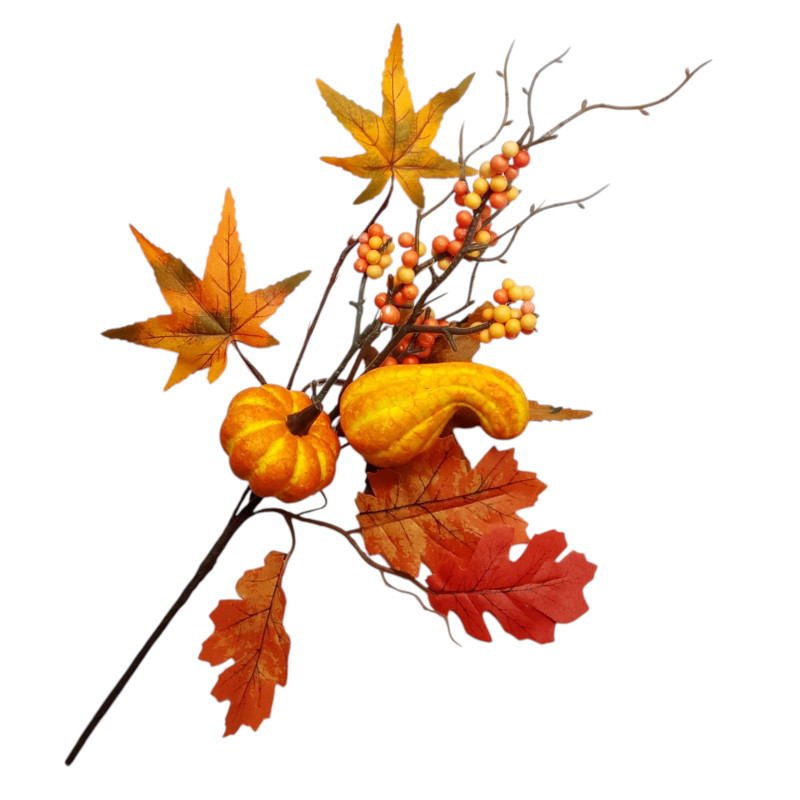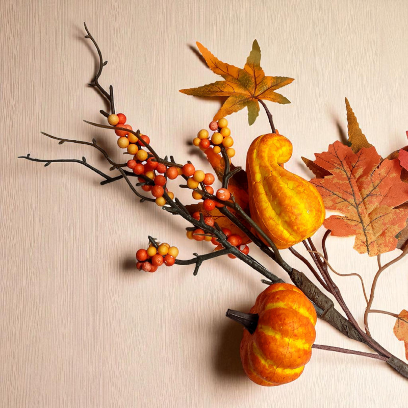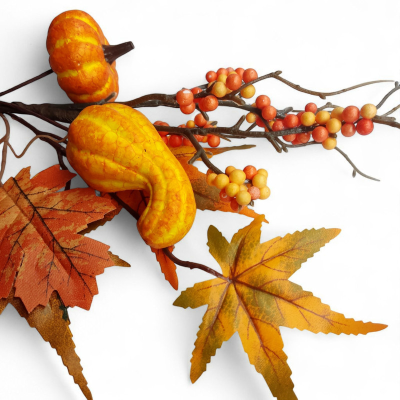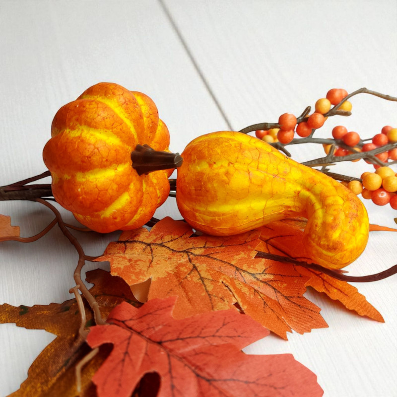Nowoczesna dekoracja do salonu, biura, wazonu lub kompozycji florystycznej. Dodaj wyjątkowy akcent do swojego wnętrza dzięki tej efektownej ozdobie z welurowymi dyniami, listkami oraz jagódkami! Realistyczne wykonanie i modna kolorystyka sprawia, że ta sztuczna roślina idealnie wpisuje się w styl boho, glamour, loftowy i skandynawski.
