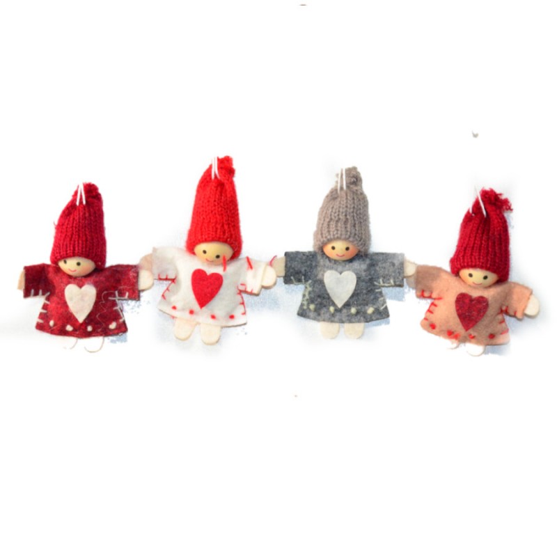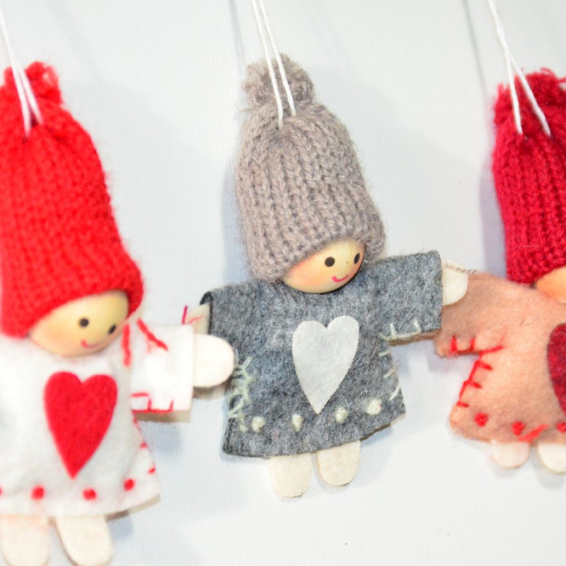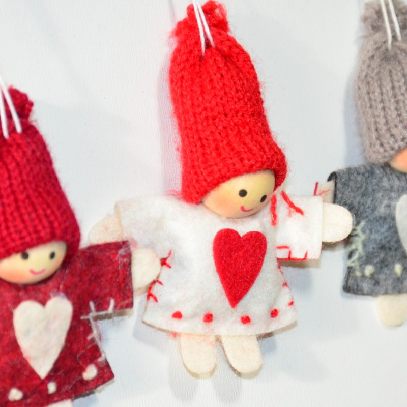 Starannie wykonane, śliczne ozdoby odziane w filcowe ubranko i czapkę z wełny mogą posłużyć jako element dekoracji Twojego domu na czas Świąt Bożego Narodzenia. Można je umieścić na wianku czy stroiku świątecznym, przystroić nimi stół, komodę, parapet okienny, powiesić na choince. Idealne przy tworzeniu aranżacji w stylu skandynawskim. Mają przepiękne kubraczki z miękiego, delikatnego materiału, długie czapki, zakończone są sznurkiem co ułatwia ich mocowanie.