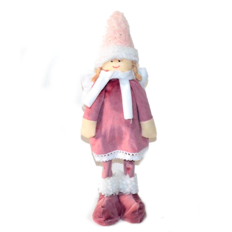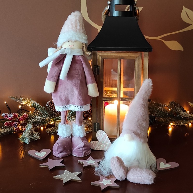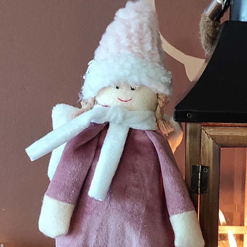 Starannie wykonany, śliczny anioł ozdobny może posłużyć jako element dekoracji Twojego domu na czas Świąt Bożego Narodzenia. Można przystroić nim stół, komodę, parapet okienny, postawić pod choinką. Idealny przy tworzeniu aranżacji na witrynie sklepowej czy sesji fotograficznej. Anioł ma przepiękny kubraczek w modnym odcieniu różu zakończony koronką, czapkę z delikatego futerka i przepiękne długie warkocze. Idealny na prezent.