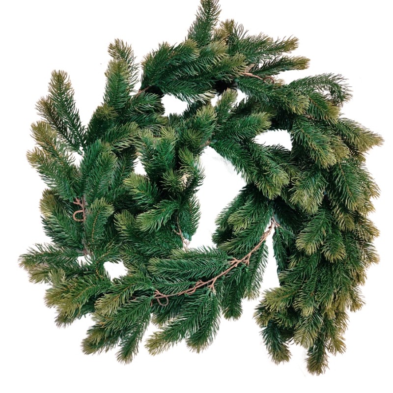 Starannie wykonana, śliczna długa ozdoba ze sztucznych gałązek uformowana w girlandę może posłużyć jako element dekoracji Twojego domu na czas Świąt Bożego Narodzenia. Można ją umieścić na firmowym biurku, przystroić nią stół, komodę, balustradę. Idealna przy tworzeniu aranżacji wystwaw sklepowych.