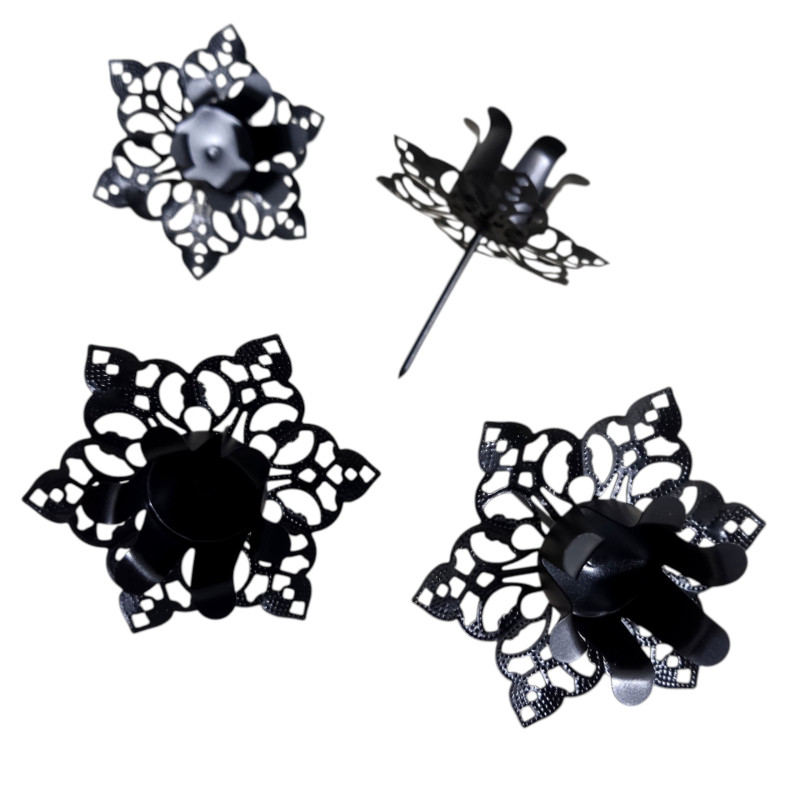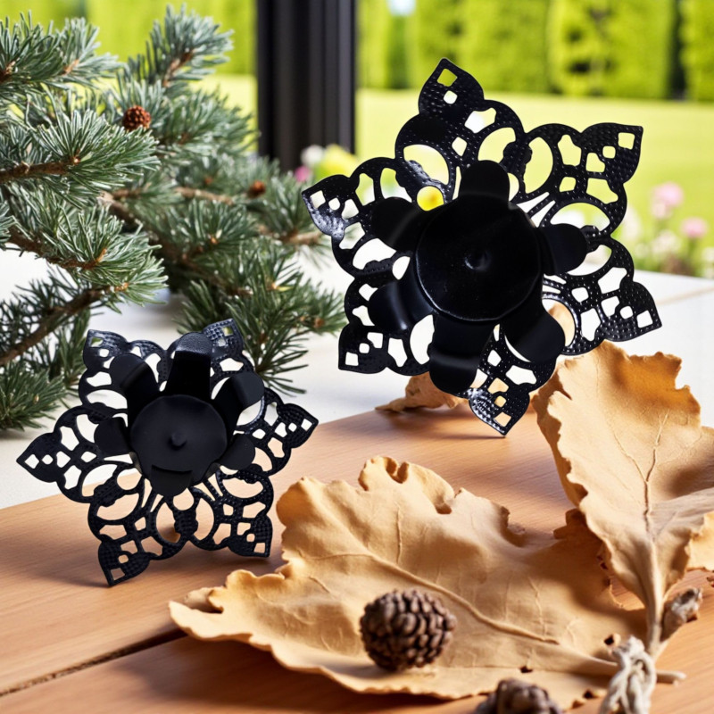 Piękne podstawki ozdobne na świece doskonale znajdują zastosowanie przy sporządzaniu stroików, dekoracji na stół. Uświetni samodzielnie wykonywane dekoracje zwłaszcza w okresie bożonarodzeniowym i nietylko. Można je wykorzystać do sporządzenia wieńca adwentowego. Na spodzie posiadają pik co ułatwia ich precyzyjne umocowanie na stroiku, wianku, choince itp.