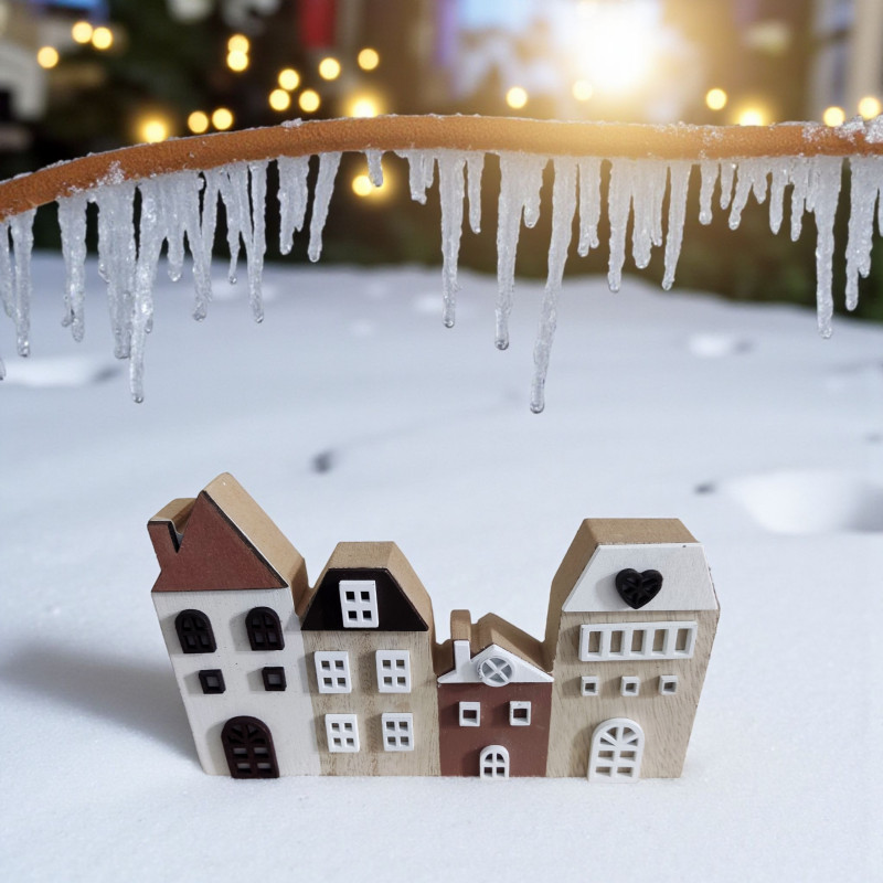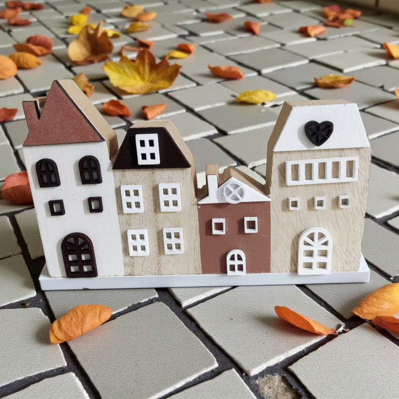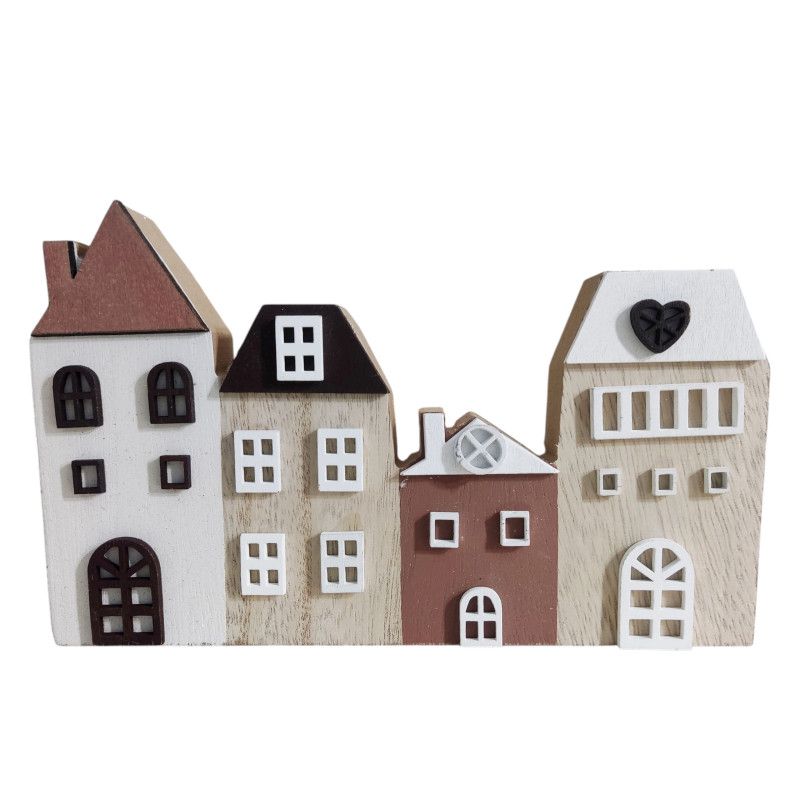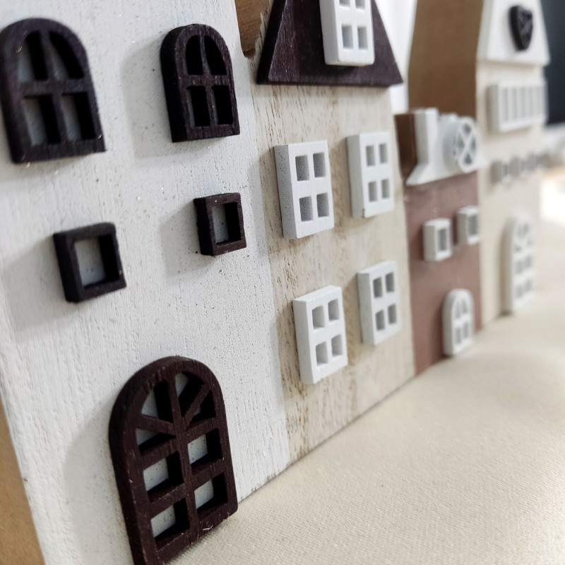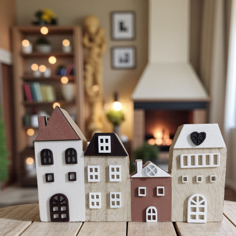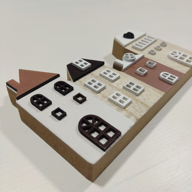 Wykonane z drewna domki 3d - ozdoba stojąca. Pozwalają stworzyć oryginalną dekorację czy ozdobę do niejednego wnętrza. Domki w kolorze białym, odcienioach brązu, ozdobione nakelajnymi oknami i dachem tworzą ozdobę przestrzenną. Można ją postawić w oknie, przy kominku ale także umieścić je stroiku, wianku. Wszystko zalezy od twojej kreatywności.