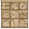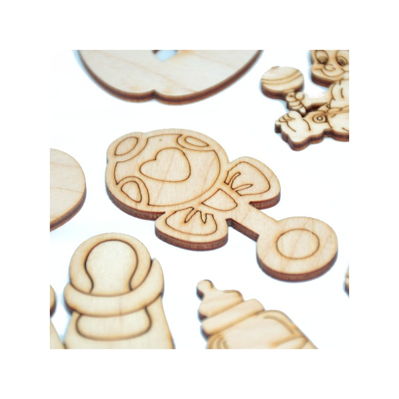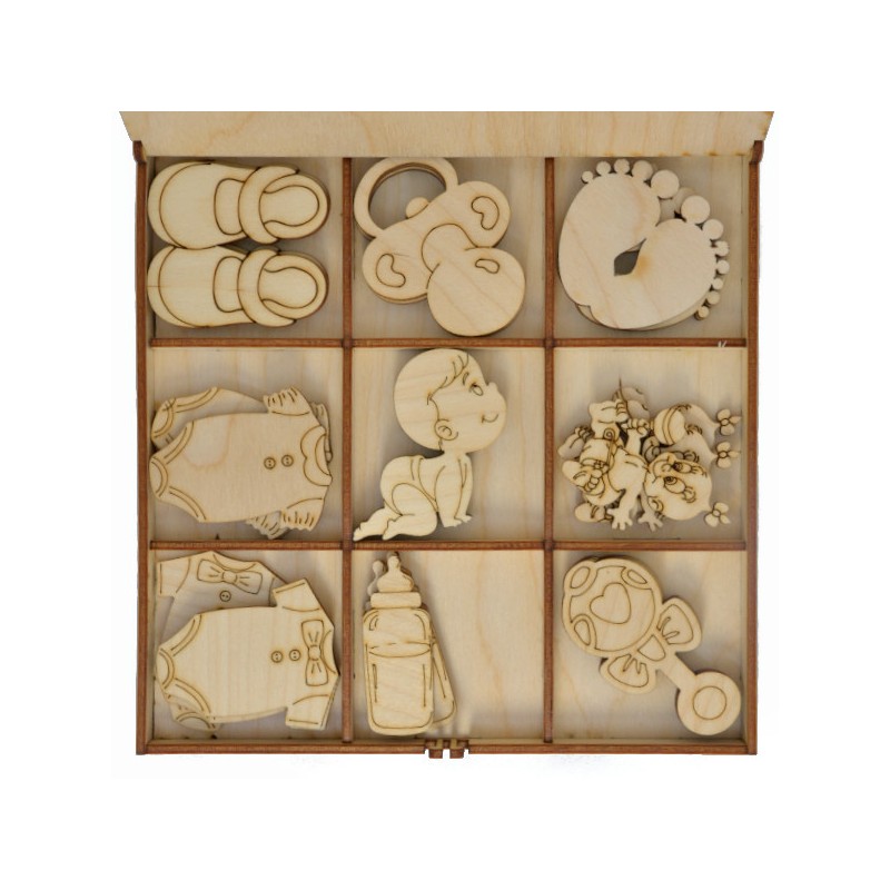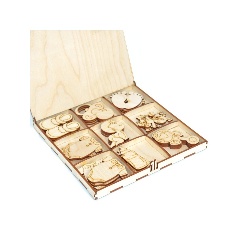 Starannie wykonane ozdoby z drewna mogą posłużyć jako element dekoracji prezentu, kartki z gratulacjami dla rodziców. Kształtki sprzedawane są w drewnianym zamykanym pudełku dzielonym na 9 przegród. W każdej przegródce znajdują się po 3 szt kształtek z danego wzoru.