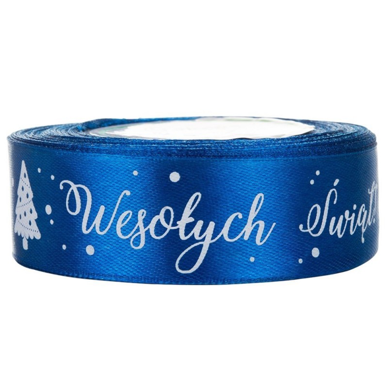 Tasiemka SATYNOWA NIEBIESKA z nadrukiem WESOŁYCH ŚWIĄT 25mm/23mb